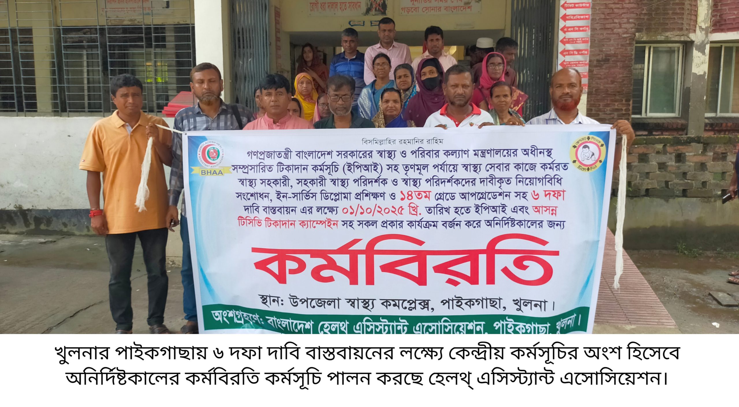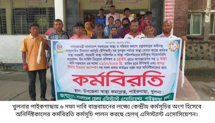 ১ অক্টোবর থেকে কর্মবিরতি শুরু হয়। সরকারি ছুটি শেষে ৪ অক্টোবর শনিবার ও অব্যাহত রয়েছে অনির্দিষ্টকালের কর্মবিরতি কর্মসূচি। স্বাস্থ্য অধিদপ্তর কর্তৃক প্রস্তাবিত মাঠ পর্যায়ে কর্মরত স্বাস্থ্য সহকারীদের নিয়োগ বিধি সংশোধন পূর্বক স্নাতক / সমমান সংযুক্ত করে ১৪ তম গ্রেড প্রদান ও ইন সার্ভিস ডিপ্লোমা প্রশিক্ষণের মাধ্যমে ১১তম গ্রেডে উন্নীতকরণ, টেকনিক্যাল পদমর্যাদা প্রদান, পদোন্নতির ক্ষেত্রে ধারাবাহিক ভাবে পরবর্তী উচ্চতর গ্রেড প্রদান সহ ৬ দফা বাস্তবায়নের দাবিতে ইপিআই এবং টিসিভি টিকাদান ক্যাম্পেইন সহ সকল কার্যক্রম বন্ধ করে এসোসিয়েশন এর পাইকগাছা উপজেলা শাখা এ অনির্দিষ্টকালের এ কর্মবিরতি পালন করছে। কর্মবিরতি পালনের সময় উপস্থিত ছিলেন এসোসিয়েশন এর উপজেলা শাখার সভাপতি সিরাজুল ইসলাম