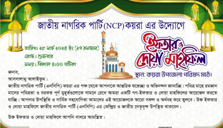 কয়রায় জাতীয় নাগরিক পার্টি’র উদ্যোগে ইফতার মাহাফিলের দাওয়াত পত্রে লেখা দেখা যায়, ‘জাতীয় নাগরিক পার্টি (এনসিপি) কয়রা এর পক্ষ থেকে পবিত্র মাহে রমজানের পবিত্রতা ও বরকত পূর্ণ মুহূর্তগুলোকে সামনে রেখে ইফতার মাহফিল। উক্ত ইফতার মাহফিলে জাতীয় নাগরিক পার্টি (এনসিপি) এর কেন্দ্রিয় ও জাতীয় নেতৃবৃন্দ উপস্থিত থাকবেন।’ দাওয়াত পত্রে করো নাম না থাকলেও যোগাযোগের জন্য দুটি ফোন নাম্বার লেখা রয়েছে। দুটি নাম্বারে কল দিলে একটিতে কথা হয় উপজেলা বৈষম্য বিরোধী ছাত্র আন্দোলনের আহ্বায়ক মো. গোলাম রব্বানীর সাথে। অপর নাম্বারে ফোন রিসিভ করেন আব্দুর রউফ নামে একজন।