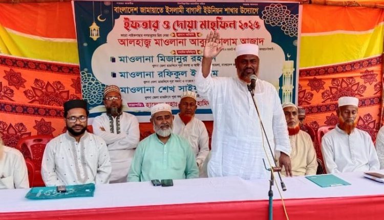 বাংলাদেশ জামায়াতে ইসলামীর কেন্দ্রীয় কর্মপরিষদ সদস্য ও খুলনা অঞ্চলের সহকারী পরিচালক মাওলানা আবুল কালাম আজাদ বলেন, জামায়াতে ইসলামীর শীর্ষ ৫ জন নেতাকে বিচারের নামে প্রহসন করে হত্যা করা হয়েছে। আরও ৬ জন নেতাকে কারাগারে বন্দি রেখে বিনা চিকিৎসায় মৃত্যু বরণ করতে বাধ্য করেছে। তিনি বলেন, ৫ আগস্টের পরে জাতি মুক্তি পেয়েছে। জেলখানা থেকে অনেকেই মুক্তি পেয়েছে। কিন্তু আমাদের প্রিয় নেতা এটিএম আজহারুল ইসলাম মিথ্যা মামলায় এখনো জেলখানায় অমানবিক যন্ত্রণা ভোগ করছেন। অবিলম্বে তাকে মুক্তি দেয়া হোক। আর যেন আইনের মারপ্যাচে তাকে বন্দি করে রাখা না হয়। আমাদের আজহারুল ইসলাম ভাইকে অবিলম্বে আমাদের মাঝে যেন ফিরিয়ে দেওয়া হয়, এই কামনা করি। তিনি বলেন, বিগত জালেম সরকার অনেকের হাত, পা ভেঙ্গে দিয়েছে। চোখ তুলে ফেলেছে। বাড়ি থেকে বিতাড়িত করা হয়েছে। অনেকের ঘরবাড়ি গুরিয়ে দেওয়া হয়েছে। এই আওয়ামী জাহিলিয়াত আর যেন দেশে ফিরে না আসে। তিনি সম্মানের সাথে স্মরণ করেন ২০২৪ সালের জুলাই-আগস্টের গণঅভ্যুত্থানে যারা জীবন দিয়েছেন ও আহত হয়েছেন তাদেরকে। মহান রাব্বুল আলামীন নিহতদের শহীদ হিসেবে কবুল করুন ও আহতদের দ্রুত সুস্থতা দান করুন। মঙ্গলবার (১৮ মার্চ) খুলনা জেলার কয়রা উপজেলার ২ নং বাঙালি ইউনিয়ন জামায়াতে ইসলামীর উদ্যোগে ষোলহালিয়া মধ্যপাড়া জামে মসজিদ প্রাঙ্গনে ইফতার মাহফিলে প্রধান অতিথির বক্তৃতায় তিনি এ সব কথা বলেন।বাগালী ইউনিয়ন আমীর হাফেজ আব্দুল হামিদের সভাপতিত্বে ও সেক্রেটারি অধ্যাপক শরিফুল ইসলামের পরিচালনায় বিশেষ অতিথি ছিলেন কয়রা উপজেলা আমীর মাওলানা মিজানুর রহমান, নায়েবে আমীর মাওলানা রফিকুল ইসলাম, সেক্রেটারি মাওলানা শেখ সাইফুল্যাহ।মাওলানা আবুল কালাম আজাদ আরও বলেন, তাক্বওয়া বা আল্লাহভীতি অর্জন করার জন্য আল্লাহ আমাদের ওপর সিয়ামকে অত্যাবশ্যকীয় বা ফরজ করে দিয়েছেন; তাই এ মুবারক মাসে যথাযথভাবে সিয়াম ও কিয়াম পালনের মাধ্যমে ইহকালীন কল্যাণ ও পরকালীন মুক্তি অর্জন করতে হবে। যাকাতভিত্তিক সমাজব্যবস্থা প্রতিষ্ঠার গুরুত্ব তুলে ধরে তিনি বলেন, শাড়ি লুঙ্গি বা খাদ্যদ্রব্য নয় বরং এমনভাবে যাকাত দেয়া উচিত, যাতে একজন ব্যক্তি স্বাবলম্বী ও প্রতিষ্ঠিত হতে পারে। ইসলামী রাষ্ট্র না হওয়ায় সরকারি যাকাত ব্যবস্থাপনায় জনগণের আস্থা নেই, তাই মানুষ সরকারকে যাকাত দিতে চায় না। বিগত ১৫ বছরে তার উপর জুলুম নির্যাতনের বর্ননা দিয়ে আরও বলেন, পতিত ফ্যাসিস্ট শেখ হাসিনা চেয়েছিলো তিলে তিলে দাড়ি টুপিওয়ালা মানুষ ও আলেম-উলামাদের শেষ করতে কিন্তু আল্লাহ রব্বুল আলামিন তা হতে দেননি। অতীতের চাঁদাবাজি, টেন্ডারবাজী জুলুম নির্যাতন দখলদারিত্ব সাধারণ মানুষ যেমন মেনে ন