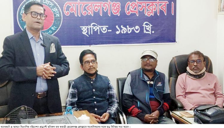 বাগেরহাট-৪, মোরেলগঞ্জ-শরণখোলা আসানে দলীয় নমিনেশন প্রত্যাশী মনিরুল হক গতকাল শনিবার রাত ৮টার দিকে প্রেসক্লাবে সাংবাদিকদের সাথে এক মতবিনিময় সভা করেন। সভায় তিনি ক্ষোভ প্রকাশ করে বলেন, ‘সাংবাদিকরা হচ্ছে জাতির দর্পণ।