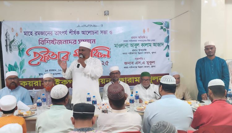 ফোরামের সভাপতি এস এ মুকুলের সভাপতিত্বে ও সাধারণ সম্পাদক হেলাল উদ্দিনের পরিচালনায় বিশেষ অতিথি ছিলেন ফোরামের উপদেষ্টা বিশিষ্ট আইনজীবী লস্কর শাহ আলম, খুলনা প্রেসক্লাবের আহবায়ক কমিটির সদস্য বিশিষ্ট সাংবাদিক শেখ দিদারুল আলম, বিশিষ্ট শিক্ষাবিদ অধ্যাপক ড. জি এম শফিকুল ইসলাম, বিশিষ্ট আইনজীবী শফিকুল ইসলাম লিটন, এডভোকেট আওসাফুর রহমান, এডভোকেট মাফতুন আহমেদ, জেলা প্রশাসক কার্যালয়ের সিনিয়র কর্মকর্তা শাহিনুর রহমান, হাফিজুর রহমান মন্টু। এতে অন্যান্যের মধ্যে অন্যের মধ্যে বক্তব্য রাখেন মোঃ রায়হান কবির,মনির হোসেন , সাদিক হোসেন, আহসান হাবিব ইমন, শরিফুল ইসলাম, আব্দুর রহমান, রাকিব হোসেন, তারেক রহমান-প্রমুখ উপস্থিত ছিলেন।মাওলানা আবুল কালাম আজাদ আরও বলেন, কুরআন ও সুন্নাহর নির্দেশিত পথে পরিচালিত জীবন গঠনের মাধ্যমে বৈষম্যহীন সমাজ প্রতিষ্ঠা করা সম্ভব। আল্লাহ রমযান মাসে কুরআন নাজিল করেছেন, যা তাকওয়া অর্জন ও দান-সাদকার গুরুত্ব তুলে ধরে। সবার উচিত আল্লাহর বিধান মেনে চলা এবং সমাজের কল্যাণে ভূমিকা রাখা। তিনি বলেন, আল্লাহ সর্বশক্তিমান, তিনি যখন যাকে ইচ্ছা ক্ষমতায় বসান এবং যখন যাকে ইচ্ছা ক্ষমতাচ্যুত করেন। তার চেয়ে বড় শক্তিমান এই পৃথিবীতে আর কেউ নেই। তিনি বলেন, ফ্যাসিস্ট হাসিনা দেশের মানুষের সাথে ১৭ বছর ধরে অন্যায়, জুলুম, নির্যাতন চালিয়েছে এবং মানুষের অধিকার হরণ করেছে। আগস্টের গণঅভ্যুত্থানের মাধ্যমে তার পতন ঘটেছে এবং আল্লাহ তাকে দেশ ত্যাগ করতে বাধ্য করেছেন।