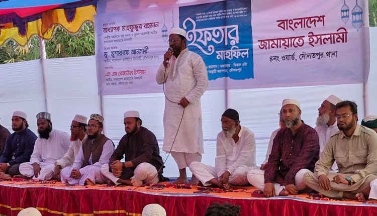 ৪ নং ওয়ার্ড আমীর মো. রেজাউল ইসলামের সভাপতিত্বে বিশেষ অতিথি ছিলেন দৌলতপুর থানা আমীরমাওলানা মোশাররফ আনসারী। এতে অন্যান্যের মধ্যে থানা সেক্রেটারি মাওলানা মহিউদ্দিন, শ্রমিক নেতা মো. রফিকুল ইসলাম, সাবেক ৪ নং কাউন্সিলর মোহাম্মদ আশরাফ হোসেন, গাজী ওয়াহিদুল ইসলামসহ স্থানীয় গন্যমান্য ব্যক্তিবর্গ উপস্থিত ছিলেন। ইফতার মাহফিলে বিশ্বের মুসলিম উম্মাহর শান্তি কামনায় বিশেষ দোয়া মোনাজাত অনুষ্ঠিত হয়।