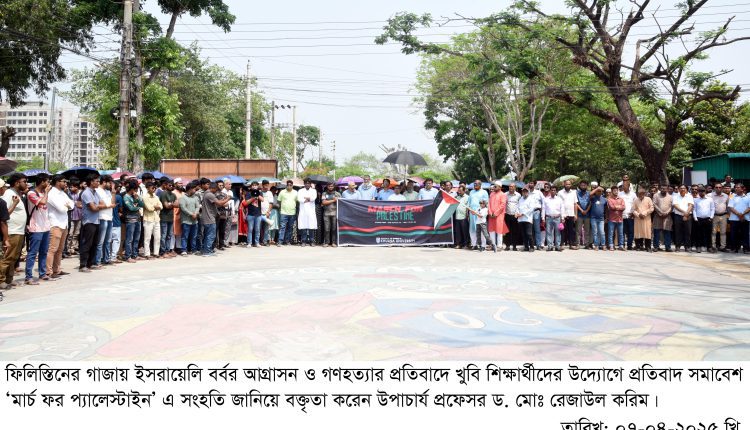 ফিলিস্তিনের গাজায় ইসরায়েলি বর্বর আগ্রাসন ও নারকীয় হত্যাযজ্ঞের প্রতিবাদ এবং গাজার জনগণের প্রতি সংহতি জানিয়ে আজ ০৭ এপ্রিল (সোমবার) খুলনা বিশ্ববিদ্যালয়ের শিক্ষার্থীদের উদ্যোগে প্রতিবাদ সমাবেশ ‘মার্চ ফর প্যালেস্টাইন’ অনুষ্ঠিত হয়। সকাল ১০.৩০ মিনিটে বিশ্ববিদ্যালয়ের হাদী চত্বরে এ সমাবেশ শুরু হয়। সমাবেশে বিশ্ববিদ্যালয়ের শিক্ষার্থীদের পাশাপাশি বিপুল সংখ্যক শিক্ষক, কর্মকর্তা ও কর্মচারীবৃন্দ অংশগ্রহণ করেন।সমাবেশে সংহতি জানিয়ে বক্তৃতা করেন বিশ্ববিদ্যালয়ের উপাচার্য প্রফেসর ড. মোঃ রেজাউল করিম। তিনি বলেন, ইসরায়েলি আগ্রাসনে ফিলিস্তিনের গাজায় প্রতিনিয়ত হাজার হাজার মানুষ হত্যার শিকার হচ্ছে। তাদের বর্বরতা থেকে নারী-শিশু কেউ রেহাই পাচ্ছে না। অনবরত বোমার আঘাতের মসজিদ-মাদ্রাসা, হাসপাতাল, শিক্ষা প্রতিষ্ঠান গুড়িয়ে দেওয়া হচ্ছে। অথচ বিশ্ব মানবতা তার দিকে কোনো নজর দিচ্ছে না। তাদের নিরব ভূমিকার কারণে প্রতিনিয়ত হামলার মাত্রা তীব্র হচ্ছে।তিনি আরও বলেন, দখলদার ইসরায়েলি বর্বরতা রুখে দিতে অখণ্ড ফিলিস্তিনের পক্ষে মুসলিম বিশ্বকে ঐক্যবদ্ধ হতে হবে। গাজা, পশ্চিম তীরসহ ফিলিস্তিনের সব অঞ্চলের মানুষের স্বাভাবিক জীবনের নিশ্চয়তা প্রদান করতে হবে। স্বাধীন ফিলিস্তিন রাষ্ট্র প্রতিষ্ঠায় মুসলিম বিশ্বকে অগ্রণী ভূমিকা পালন করতে হবে।সমাবেশে আরও বক্তৃতা করেন উপ-উপাচার্য প্রফেসর ড. মোঃ হারুনর রশীদ খান। তিনি বলেন, বছরের পর বছর ইসরায়েলের হামলার শিকার হচ্ছেন ফিলিস্তিনের নিরীহ মানুষরা। অথচ বিশ্ব মোড়ল তথা পশ্চিমা বিশ্ব ইসরায়েলের এই বর্বরতাকে সমর্থন দিয়ে যাচ্ছে। যেসকল শিক্ষার্থীরা ফিলিস্তিনের পাশে দাঁড়াচ্ছে কিংবা সমর্থন দিচ্ছে, তাদের ভিসা বাতিল করছে। এই অন্যায়-অবিচারের বিরুদ্ধে সকলকে ঐক্যবদ্ধ হতে হবে। বিশ্ব সম্প্রদায়কে ফিলিস্তিনের নির্যাতিত-নিপীড়িত জনগণের পক্ষে দাঁড়িয়ে তাদের অধিকার প্রতিষ্ঠা করতে হবে।