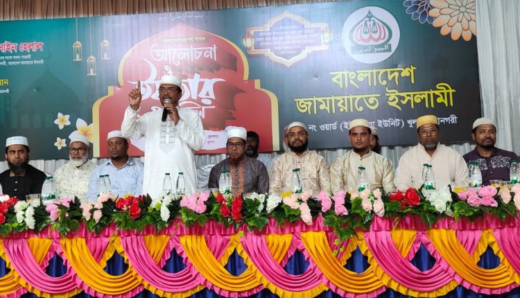 বাংলাদেশ জামায়াতে ইসলামীর কেন্দ্রীয় শূরা সদস্য ও খুলনা মহানগরী সেক্রেটারি এডভোকেট শেখ জাহাঙ্গীর হুসাইন হেলাল বলেছেন, আওয়ামী লীগের মতই যারা নিজস্ব মতবাদে রাষ্ট্র পরিচালনা করেছে এবং করবে তারা জনগণকে ধোঁকা দিয়েছে এবং আগামীতেও দিবে। মানুষের তৈরি আইনে শুধুমাত্র ক্ষমতাসীন দলের ও তাদের সাঙ্গপাঙ্গদের উপকার হয়, জনগণের নয়। বরং তারা জনগণকে চুষে খেয়েছে । তাই ইসলামী সমাজ বিনির্মাণের মাধ্যমে জনগণের শান্তি ও নিরাপত্তা নিশ্চিত করতে হবে। রমাদান কুরআন নাযিলের ও বিজয়ের মাস। এই রমাদানের শিক্ষায় বাংলাদেশের শাসন ব্যবস্থায় কুরআনের শাসন কায়েমের মাধ্যমে কুরআনের বিজয় নিশ্চিত করতে হবে। বুধবার (১৯ মার্চ) খুলনা মহানগরীর সদও থানাধীন ২৩ নং ওয়ার্ডের ইউসুফিয়া ইউনিট জামায়াতে ইসলামীর উদ্যোগে খুলনা প্রেসক্লাবের ব্যাংকুয়েট হলে ইফতার মাহফিলে প্রধান অতিথির বক্তৃতায় তিনি এ সব কথা বলেন।ইউসুফিয়া ইউনিটের সভাপতি ও ২৩ নং ওয়ার্ড যুববিভাগের সভাপতি মো. শহীদুল ইসলামের সভাপতিত্বে বিশেষ অতিথি ছিলেন খুলনা সদর থানা আমীর এস এম হাফিজুর রহমান, সেক্রেটারি আব্দুস সালাম, সদর থানার সহকারী সেক্রেটারি ও ২৩ নং ওয়ার্ড সভাপতি হুমায়ুুন কবির, সদর থানার বায়তুমাল সম্পাদক এস এম মোয়াজ্জম হুসাইন, থানা প্রশিক্ষণ সম্পাদক হাফেজ মাওলানা সাইফুল্লাহ মনসুর, ২৩ নং ওয়ার্ড সেক্রেটারি মাওলানা সাব্বির তরফদার। ইউসুফিয়া ইউনিটের সেক্রেটারি মাসুদ রানার পরিচালনায় ইসলামী ছাত্র শিবিরের সদর থানা সভাপতি সাকিবুল ইসলাম ও ২৩ নং ওয়ার্ড সভাপতি মহিউল ইসলাম, ওয়ার্ড জামায়াতের সমাজসেবা সম্পাদক আবু সাঈদ, ফুল মার্কেটে ইউনিটের সভাপতি এম এম জামিরুল ইসলাম, ডাকবাংলা ইউনিটের সভাপতি কাজী মো. ইউনুছ, ওলামা বিভাগের সেক্রেটারি মাওলানা হাবিবুল্লাহ বেলালী, রয়েল মোড় ইউনিটের সভাপতি আব্দুল হাকিম, মো. শাহজাহান, মো. লাভলু সরদার, মানজারুল ইসলাম, আল-আমিন, নুরে আলম মানিক, মো. সোহেল উপস্থিত ছিলেন।কুরআনের সমাজ বিনির্মানের মাধ্যমে সোনার মদিনার মতই সোনার বাংলা গঠন করতে হবে উল্লেখ করে এডভোকেট শেখ জাহাঙ্গীর হুসাইন হেলাল বলেন, যেই সমাজ ব্যবস্থায় মদিনায় শান্তি প্রতিষ্ঠা হয়েছে, সেই সমাজ ব্যবস্থা প্রতিষ্ঠা করতে পারলেই বাংলাদেশেও শান্তি প্রতিষ্ঠা হবে। সোনার মদিনা গঠনের আগে মহানবী (সা.) সোনার মানুষ তৈরি করেছে। সোনার বাংলা গঠনের জন্য জামায়াতে ইসলামীতে অসংখ্য সোনার মানুষ রয়েছে। জামায়াতে ইসলামীর ৪ দফা কর্মসূচির অন্যতম হচ্ছে শিক্ষা ও প্রশিক্ষণ। জামায়াতে ইসলামী ও ইসলামী ছাত্র শিবির অসংখ্য মানুষকে ইসলাম ও নৈতিক শিক্ষা এবং প্রশিক্ষণ দিয়ে সোনার মানুষ হিসেবে তৈরি করেছে। যার প্রমাণ জামায়াতে ইসলামীর সাবেক আম