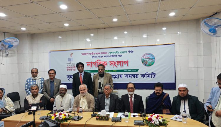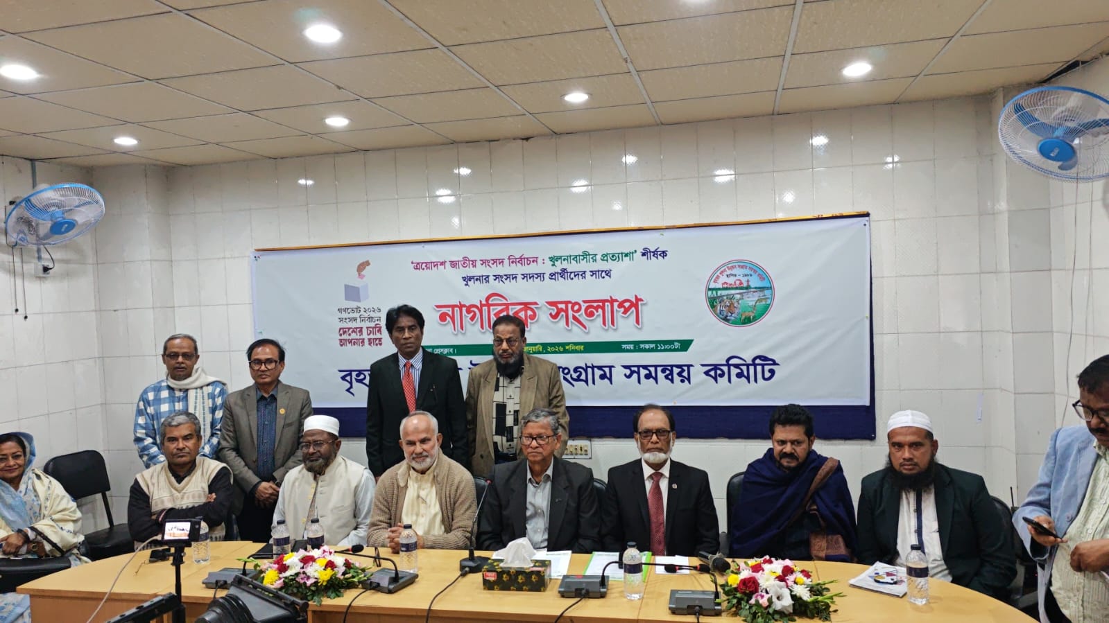অবহেলিত ও বঞ্চনার শিকার খুলনাকে একটি সমৃদ্ধ উন্নত জনপদ হিসাবে গড়ে তুলতে দলমত নির্বিশেষে এক সাথে কাজ করার অঙ্গীকার । বৃহত্তর খুলনা উন্নয়ন সংগ্রাম সমন্বয় কমিটি আয়োজিত ত্রয়োদশ জাতীয় সংসদ নির্বাচনঃ খুলনাবাসীর প্রত্যাশা শীর্ষক নাগরিক সংলাপ অনুষ্ঠানে খুলনার বিভিন্ন আসনের প্রতিদ্বন্দ্বিতাকারী প্রার্থীগণ অবহেলিত ও বঞ্চনার শিকার খুলনাকে একটি সমৃদ্ধ উন্নত জনপদ হিসাবে গড়ে তুলতে দলমত নির্বিশেষে খুলনার সকল শ্রেনি-পেশার মানুষের প্রতি এক সাথে কাজ করার আহবান জানিয়েছেন। অদ্য ১৭ জানুয়ারি শনিবার সকালে খুলনা প্রেসক্লাবের হুমায়ুন কবীর বালু মিলনায়তনে আয়োজিত নাগরিক সংলাপ অনুষ্ঠানে সংসদ সদস্য প্রার্থীগণ এ আহবান জানিয়ে বলেন খুলনার অপার সম্ভাবনা রয়েছে কিন্তু দীর্ঘদিনেও সেই সম্ভাবনাকে কাজে লাগানো হয়নি। এক সময়ের শিল্প ও বন্দর নগরী হিসেবে খ্যাত খুলনা আজ শিল্পহীন নগরীতে পরিনত হয়েছে। এতে করে বেকার সংখ্যা বাড়ছে, কর্মসংস্থানের অভাবে এ অঞ্চলের মানুষ অন্যত্র চলে যাচ্ছে। খুলনা অঞ্চলকে একটি পরিবেশ বান্ধব ও সকলের জন্য বাসযোগ্য হিসেবে গড়ে তুলতে একসাথে কাজ করার জন্য প্রার্থীগণ অঙ্গীকার ব্যক্ত করেন। প্রার্থীগন বলেন আমরা সকলে যে যার অবস্থান থেকে খুলনার উন্নয়নের আন্দোলনে সবাই একসাথে কাজ করেত চাই। প্রার্থীগণ উন্নয়ন কমিটির সকল আন্দোলন কর্মসূচী সফলে সবরকম সহযোগিতা করার আশ্বাস প্রদান করেন। নাগরিক সংলাপ অনুষ্ঠানে সংসদ সদস্য প্রার্থীগণের মধ্যে উপস্থিত ছিলেন খুলনা ২ আসনের বিএনপি মনোনীত প্রার্থী নজরুল ইসলাম মঞ্জু, বাংলাদেশ জামায়াতে ইসলামী মনোনীত প্রার্থী এ্যাডভোকেট জাহাঙ্গীর হুসাইন হেলাল, খুলনা ১ আসনের বিএনপি মনোনীত প্রার্থী আমীর এজাজ খান, খুলনা ৩ আসনের বাংলাদেশ জামায়াতে ইসলামী মনোনীত প্রার্থী অধ্যাপক মাহফুজুর রহমান, বাসদ মনোনীত প্রার্থী জনার্দ্দন দত্ত নান্টু, স্বতন্ত্র প্রার্থী মুরাদ খান লিটন ও খুলনা ৬ আসনের ইসলামী আন্দোলন বাংলাদেশ মনোনীত প্রার্থী হাফেজ আসাদুল্লাহ আল গালিব। বৃহত্তর খুলনা উন্নয়ন সংগ্রাম সমন্বয় কমিটির সভাপতি শেখ আশরাফ উজ জামান এর সভাপতিত্বে ও বিশিষ্ট শিক্ষাবিদ অধ্যাপক আনোয়ারুল কাদির মিরুর সঞ্চালনায় অনুষ্ঠিত নাগরিক সংলাপে স্বাগত বক্তৃতা করেন উন্নয়ন কমিটির মহাসচিব এ্যাড. শেখ হাফিজুর রহমান হাফিজ। অনুষ্ঠানের শুরুতে পবিত্র কোরআন তেলাওয়াত করেন মাওলানা মুফতি এবাদুর রহমান, পবিত্র গীতা পাঠ করেন ভগবান চন্দ্র মন্ডল। উপস্থিত খুলনার বিশিষ্ট নাগরিক নেতৃবৃন্দ বলেন খুলনা দীর্ঘদিন ধরেই অবহেলা ও বঞ্চনার শিকার সরকারের পালাবদল হয় কিন্তু খুলনার কাঙ্খিত উন্নয়ন হয়না। নাগরিক নেতৃবৃন্দ খুলনার আইন শৃংখলা পরিস্থি