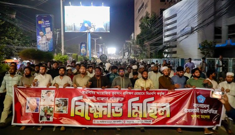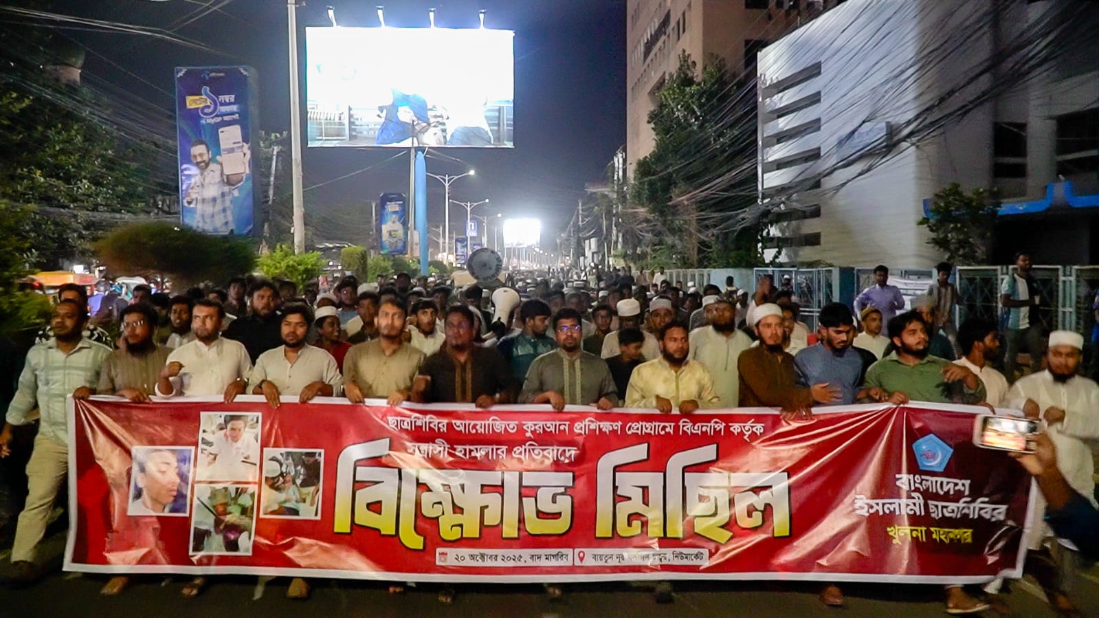 ছাত্রশিবির খুলনা মহানগর শাখার সভাপতি আরাফাত হোসেন মিলনের সভাপতিত্বে এবং সেক্রেটারি রাকিব হাসানের পরিচালনায় বিক্ষোভ মিছিল ও সমাবেশে বিশেষ অতিথি হিসেবে বক্তব্য রাখেন ছাত্রশিবির খুলনা মহানগর শাখার সাবেক সভাপতি আজিজুল ইসলাম ফারাজী এবং জাহিদুর রহমান নাঈম।