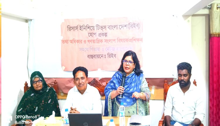 কেশবপুর (যশোর) প্রতিনিধি:যশোরের কেশবপুরে রিইব এর হোপ প্রকল্প তথ্য অধিকার ও গণতান্ত্রিক সংলাপ বিষয়ক উপজেলা ও জেলা সিএসও কমিটির প্রশিক্ষন অনুষ্ঠিত হয়েছে কেশবপুর নিউজ ক্লাব হল রুমে।