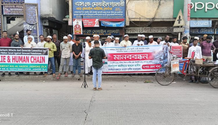 মানববন্ধনে বক্তরা ইসরায়েলের পন্য বর্জন এবং ফিলিস্তিনে নারী শিশু সহ বর্বর হত্যাকাণ্ডের তীব্র প্রতিবাদ করে বক্তব্য প্রদান করেন। বাংলাদেশ জমঈয়তে আহলে হাদীসের যশোর জেলার সভাপতি অধ্যাপক আহমদ আলীর নেতৃত্বে মানববন্ধন কর্মসূচি পালন করা হয়।