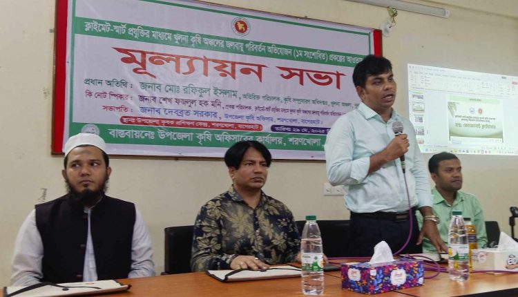 শরলখোলা( বাগেরহাট) প্রতিনিধিঃবাগেরহাটের শরণখোলায় ক্লাইমেট – স্মার্ট প্রযুক্তির মাধ্যমে খুলনা কৃষি অঞ্চলের জলবায়ু পরিবর্তন অভিযোজন প্রথম সংশোধনী প্রকল্পের মূল্যায়ন সভা অনুষ্ঠিত হয়েছে। ২৯ জুলাই দুপুর ১২ টায় শরণখোলা উপজেলা কিসে প্রশিক্ষণ কেন্দ্রে মূল্যায়ন সভা অনুষ্ঠিত হয়। উপজেলা কৃষি কর্মকর্তা দেবব্রত সরকারের সভাপতিত্বে অনুষ্ঠিত সভায় প্রধান অতিথি হিসেবে উপস্থিত ছিলেন ক্লাইমেট স্মার্ট প্রযুক্তি প্রকল্প পরিচালক। অনুষ্ঠানে অন্যন্যের মধ্যে বক্তব্য রাখেন, উপজেলা কৃষি সম্প্রসারণ কর্মকর্তা ইমতিয়াজ উদ্দিন, কৃষি ব্যাংকের স্বয়ংক্রিয় শাখার ম্যানেজার সঞ্জয় দেবনাথ, উপজেলা প্রেসক্লাবের সভাপতি সহকারী অধ্যাপক আঃ মালেক রেজা, প্রকল্পের মনিটরিং অফিসার ধীমান মজুমদার, জাইকা প্রকল্প কর্মকর্তা রিয়াজুর রহমান, সাংবাদিক নইন আবু নাঈম তালুকদার , সাংবাদিক শামীম হাসান সুজন, সারের ডিলার ও ব্যবসায়ী মোঃ সরোয়ার হোসেন, শহিদুল ইসলাম, সাংবাদিক শাহীন হাওলাদার, উদ্যোক্তা সরোয়ার হোসেন বাদল, কৃষক সুমন,নাছির মুন্সি। সভায় বক্তারা কৃষির উৎপাদনে কি কি সমস্যা রয়েছে তা তুলে ধরেন। প্রধান অতিথি তার বক্তব্যে বলেন জলবায়ু পরিবর্তনের সাথে অভিযোজন এ সক্ষম ক্লাইমেট স্মার্ট কৃষি প্রযুক্তি গ্রহণ ও পতিত জমি চাষের আওতায় আনার মাধ্যমে প্রকল্প এলাকায় ফসলের নিবিড়তা কি ভাবে বৃদ্ধির বৃদ্ধি করা যায় এবং সুষ্ঠু পানি ব্যবস্থাপনার ও মাটির স্বাস্থ্য সুরক্ষা এবং উচ্চ ফলনশীল ফল এবং সবজি আবাদ সম্প্রসারণের মাধ্যমে ফসলে উৎপাদন কিভাবে বৃদ্ধি করা যায় সে সম্পর্কে অবহিত করেন।