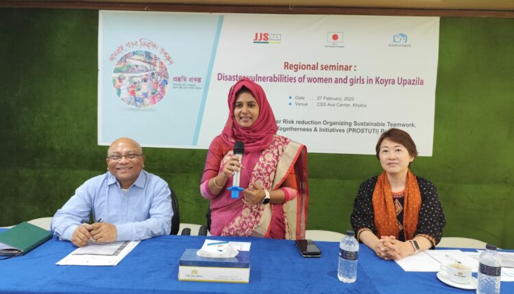 জাগ্রত যুব সংঘ (জেজেএস) আয়োজিত সেমিনারে বক্তারা বলেন, বাংলাদেশের দক্ষিণ-পশ্চিম উপকূলীয় অঞ্চলে ঘূর্ণিঝড় ক্রমাগত হুমকি হয়ে উঠেছে। যা নারী ও মেয়েদের উপর গুরুতর আর্থ-সামাজিক সমস্যার সৃষ্টি করছে। এ ধরনের ঝুঁকিপূর্ণ পরিবেশের মধ্যে নারী ও মেয়েরা তুলনামূলকভাবে বেশি চ্যালেঞ্জের সম্মুখীন হয় উল্লেখ করে বক্তারা উপকূলীয় অঞ্চলে আশ্রয়কেন্দ্রে নারীদের জন্য পৃথক স্থান, নিরাপদ ল্যাট্রিন এবং পর্যাপ্ত আলোর সুবিধা সম্বলিত আশ্রয়কেন্দ্র তৈরির দাবি জানান। একইসাথে গর্ভবতী নারী এবং প্রতিবন্ধী ও দুর্বল জনগোষ্ঠীর জন্য উঁচু আশ্রয়কেন্দ্রের সাথে সঠিক যাতায়াত ব্যবস্থা সম্বলিত আশ্রয়কেন্দ্রের নকশা প্রণয়নেরও দাবি জানানো হয়। বৃহস্পতিবার সকালে নগরীর রূপসা স্ট্রান্ড রোডে সিএসএস আভা সেন্টারে কয়রা উপজেলায় নারী ও মেয়েদের দুর্যোগের ঝুঁকি বিষয়ক এ আঞ্চলিক