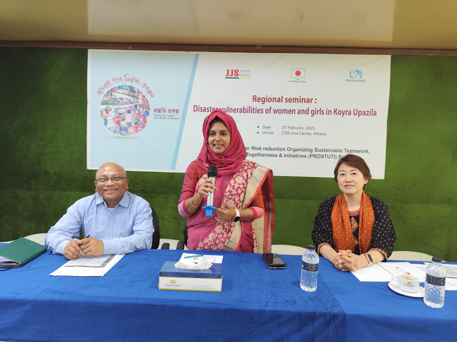 সেমিনার অনুষ্ঠিত হয়। এসময় জাপানের শাপলা নীর-এর সহযোগিতায় জেজেএস-এর প্রস্তুতি প্রকল্পের আওতায় পরিচালিত একটি গবেষণা কার্যক্রমেরও সংক্ষিপ্ত প্রতিবেদন তুলে ধরাহয়। জেজেএসএর নির্বাহী পরিচালক এটিএম জাকির হোসেনের সভাপতিত্বে ও সমন্বয়কারী নাজমুল হুদার পরিচালনায় এসময় প্রধান অতিথির বক্তৃতা করেন, খুলনার অতিরিক্ত জেলা প্রশাসক(শিক্ষা ও আইসিটি) সাদিয়া আফরিন। মূল প্রবন্ধ উপস্থাপন করেন খুলনা বিশ্ববিদ্যালয়ের সহযোগী অধ্যাপক ও প্রধান গবেষক মোঃ মোস্তাফিজুর রহমান। প্যানেল আলোচনায় অংশ নেন খুলনা বিশ্ববিদ্যালয়ের প্রফেসর ড. মোঃ জাকির হোসেন এবং মাছরাঙা টিভির বিশেষ প্রতিনিধি আবু হেনা মোস্তফা জামাল পপলু। অন্যান্যের মধ্যে বক্তৃতা করেন, শাপলা নীরের প্রতিনিধি এমিকো ফুজিওকা, হিরোমি কাতসুই, তোমোকো উচিয়ামা, এমডি আনিছুজ্জামান, বাংলাদেশ ফেডারেল সাংবাদিক ইউনিয়ন-বিএফইউজে’র সহকারী মহাসচিব এহতেশামুল হক শাওন, খুলনা কৃষি বিশ্ববিদ্যালয়ের অধ্যাপক মীর রিফাত জাহান, কয়রা এলাকার বাসিন্দা বাসন্তী রানী মুন্ডা, ভারপ্রাপ্ত ইউপি চেয়ারম্যান মোঃ লুৎফর রহমান সরদার, ইউপি সদস্য শেখ সোহরাব হোসেন, সিপিপি’র উপপরিচালক গোলাম কিবরিয়া, প্রাণীসম্পদ কর্মকর্তা ডাঃ মোঃ শরীফুল ইসলাম, জেলা মহিলা বিষয়ক কর্মকর্তা সাদিয়া আফরিন জাহান, সমাজসেবা অধিদপ্তরের সহকারী পরিচালক মোঃ শফিকুল ইসলাম, ডেইলী সান’র খুলনা প্রতিনিধি গাজী মনিরুজ্জামান প্রমুখ। এতে সরকারি কর্মকর্তা, সুশীল সমাজের প্রতিনিধি, গণমাধ্যম ও শিক্ষাবিদসহ গুরুত্বপূর্ণ স্টেকহোল্ডাররা অংশ নেন।