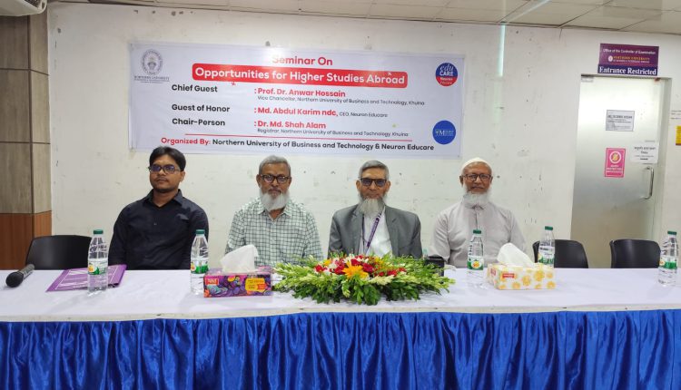 খুলনায় বিদেশে উচ্চশিক্ষার সুযোগ শীর্ষক সেমিনার অনুষ্ঠিত হয়েছে। রোববার (১ জুন) দুপুরে নর্দার্ন ইউনিভার্সিটি অফ বিজনেস অ্যান্ড টেকনোলজি খুলনা ও নিউরন এডুকেয়ারের যৌথ আয়োজনে এ সেমিনার অনুষ্ঠিত হয়।