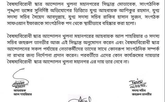 সাংগঠনিক শৃঙ্খলাভঙ্গের সুনির্দিষ্ট অভিযোগের ভিত্তিতে বৈষম্যবিরোধী ছাত্র আন্দোলন খুলনা মহানগরের ৪ নেতাকে সাংগঠনিক পদ থেকে স্থায়ীভাবে বহিষ্কার করা হয়েছে। তারা হলেন- যুগ্ম আহ্বায়ক আশিকুর রহমান, যুগ্ম সদস্যসচিব সৈয়েদ আবদুল্লাহ, যুগ্ম সদস্য সচিব রাকিব হাসান সুজন ও সংগঠক সাফওয়ান ইফাজ।