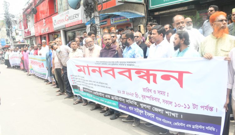 ওষুধ ব্যবসায়ীদের ৪ দফা ( ওষুধ বিক্রয় কমিশন বৃদ্ধি করা, মেয়াদ উত্তীর্ণ ওষুধ দ্রুত সময়ের মধ্যে ফেরত নেয়া এবং প্রতিস্থাপন করা, ড্রাগ লাইসেন্স বিহীন ফার্মেসিতে ওষুধ কোম্পানি কর্তৃক ওষুধ সরবরাহ বন্ধ করা ও সকল ওষুধের মূল্য সরকার কর্তৃক নির্ধারণ করা) দাবি আদায়ের লক্ষে সারা বাংলাদেশে বাংলাদেশ কেমিস্টস এন্ড ড্রাগিস্টস সমিতির আহ্বান করা কর্মসূচি বাস্তবায়নের লক্ষ্যে খুলনা জেলা শাখার উদ্যোগে বৃহস্পতিবার (২২ মে) সকালে খুলনা নগরীর পিকচার প্যালেস মোড়ে মানববন্ধন অনুষ্ঠিত হয়।