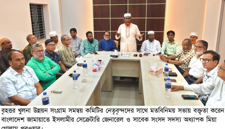 বাংলাদেশ জামায়াতে ইসলামীর সেক্রেটারি জেনারেল সাবেক এমপি অধ্যাপক মিয়া গোলাম পরওয়ার খুলনাসহ দক্ষিণাঞ্চলের উন্নয়নে সকল দল মতের উর্দ্ধে উঠে কাজ করার আহবান জানান। খুলনায় গ্যাস সরবরাহ না করে ঢাকায় নিয়ে যাওয়ার সিদ্ধান্তের প্রতিবাদে ঘোষিত সকল কর্মসূচি সফল করতে হবে। খুলনার এয়ারপোর্টে নিয়ে প্রধান উপদেষ্টা প্রফেসর ড. মুহাম্মদ ইউনুস এর সাথে কথা হয়েছে। বিষয়টি তিনি গুরুত্বের সাথে দেখবেন। এ বিষয় নিয়ে আমি পার্লামেন্টেও কথা বলেছি। তিনি বলেন, এ অঞ্চলের উন্নয়নের জন্য সকল আন্দোলন সংগ্রামে আমি সক্রিয় ছিলাম এবং ভবিষ্যতেও থাকবো। তিনি বলেন, ৫ আগস্ট গণঅভ্যুত্থানের পর আমাদের এক সাথে বসার সুযোগ হয়েছে। জামায়াত কার্যালয়ে বসে মতবিনিময় করতে পারছি। এ জন্য প্রথমে আল্লাহ তায়ালার কাছে শুকরিয়া আদায় করছি। এই গণঅভ্যুত্থানে যারা শহীদ হয়েছেন তাদের আত্মার মাগফিরাত কামনা ও আহতদের সুস্থতা কামনা করছি। রোববার (৬ এপ্রিল) দুপুর একটার দিকে নগরীর রয্যাল মোড়স্থ খুলনা মহানগরী জামায়াত কার্যালয়ে বৃহত্তর খুলনা উন্নয়ন সংগ্রাম সমন্বয় কমিটির নেতৃবৃন্দের সাথে মতবিনিময়কালে তিনি এ সব কথা বলেন।