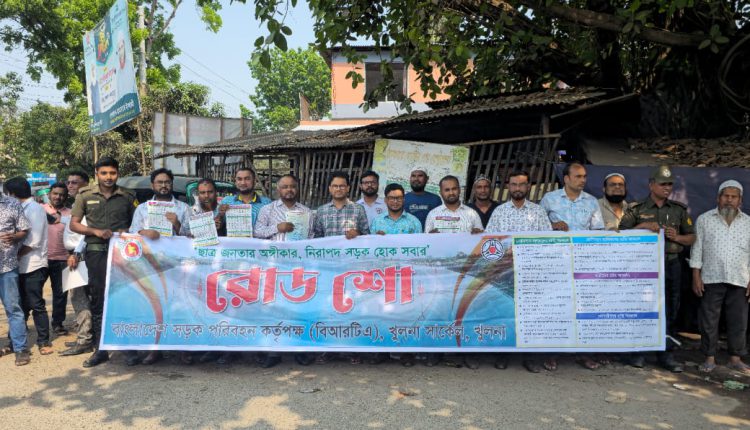 খুলনা বিআরটিএ সোমবার ১২ টায় সহকারী পরিচালক উসমান সরওয়ার আলম এর নেতৃত্বে রোড শো ও লিফলেট বিতরণ করে এবং বিভিন্ন ওয়ার্কশপ পরিদর্শন করেন। খুলনা বিআরটিএ এর সহকারী পরিচালক (ইঞ্জি:) উসমান সরওয়ার আলমের নেতৃত্বে রোড শো ও লিফলেট বিতরণ কার্যক্রমে উপস্থিত ছিলেন লাইসেন্স শাখার মোটরযান পরিদর্শক সাইফুর রহমান, রেজিস্ট্রেশন শাখার মোটরযান পরিদর্শক সাইফুল ইসলাম, উচ্চমান সহকারী রেজওয়ানুল ইসলাম, মিজানুর রহমান, আল আমিন হোসেন, দাউদ হোসেন, নিরাপদ সড়ক চাই খান জাহান আলী থানার আহ্বায়ক শেখ আব্দুস সালাম সহ বিআরটিএ খুলনা সার্কেলের সকল কর্মকর্তা ও কর্মচারীগণ এবং এলাকার সাধারণ জনগ।এসময় রোড শো শেষ করে বিভিন্ন যানবাহনের চালকদের আসন্ন পবিত্র ঈদুল ফিতর সামনে রেখে গণসচেতনামূলক লিফলেট বিতরণ করেন। চালকদের ঈদ উপলক্ষে অতিরিক্ত যাত্রী বহন এবং অতিরিক্ত ভাড়া আদায় থেকে বিরত থাকার নির্দেশনা প্রদান করেন। এছাড়া চালকদের নির্দেশনা দেন গতি সীমা মেনে চলতে হবে, গাড়ি চালানোর সময় মোবাইল ফোন ব্যবহার করা যাবে না, ড্রাইভিং লাইসেন্স ও বৈধ কাগজপত্র গাড়িতে রাখতে হবে, ট্রাফিক আইন মেনে চলতে হবে, ওভারটেকিং করা যাবে না, কোনভাবেই নেশা জাতীয় দ্রব্য সেবন করা যাবে না, যাত্রীদের নিরাপদে ওঠানামা করাতে হবে এবং তাদের সাথে ভালো ব্যবহার করতে হবে। যাত্রীদের প্রতি নির্দেশনা দেন চলন্ত গাড়িতে উঠানামা করা যাবে না, তাড়াহুড়া করে গাড়ি থেকে নামা যাবে না, নামার সময় অবশ্যই বাম পা আগে দিতে হবে।খুলনা বিআরটিএ সহকারী পরিচালকের নেতৃত্বে খুলনা শহরে বিভিন্ন ওয়ার্কশপ পরিদর্শক করে তাদের নির্দেশনা দেয় পুরানো ফিটনেট বিহীন গাড়ি রং করে কোনভাবেই রাস্তায় নামানো যাবে না অন্যথায় ওয়ার্কশপের এর বিরুদ্ধে বিআরটিএ আইনগত ব্যবস্থা গ্রহণ করবে।