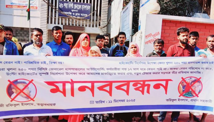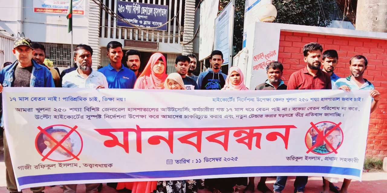 মানববন্ধনে প্রদর্শিত ব্যানারে লেখা ছিল ১৭ মাস বেতন নাই! পারিশ্রমিক চাই, ভিক্ষা নয়, হাইকোর্টের নির্দেশ উপেক্ষা কেন? খুলনা ২৫০ শয্যা হাসপাতাল–জবাব চাই।