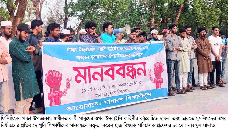 ফিলিস্তিনের গাজা উপত্যকায় স্বাধীনতাকামী মানুষের ওপর ইসরাইলি বাহিনীর অমানবিক ও বর্বরোচিত হামলা এবং ভারতের মুসলিমদের উপর নির্যাতনের প্রতিবাদে মানববন্ধন করেছে খুলনা বিশ্ববিদ্যালয়ের (খুবি) শিক্ষার্থীরা। আজ বুধবার (১৯ মার্চ) বিকেল সাড়ে ৫টায় বিশ্ববিদ্যালয়ের হাদি চত্ত্বরে এ মানববন্ধন কর্মসূচি পালিত হয়।