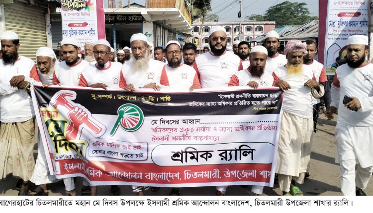 ‘শ্রমিক মালিক ভাই ভাই, সোনার বাংলা গড়তে চাই।’ এই শ্লোগানকে সামনে রেখে বাগেরহাটের চিতলমারীতে মহান মে দিবস উপলক্ষে র্যালী ও আলোচনা সভা হয়েছে। বৃহস্পতিবার (১ মে) সকাল ৮ টায় ইসলামী শ্রমিক আন্দোলন বাংলাদেশ চিতলমারী উপজেলা শাখা এ র্যালী ও আলোচনা সভা করে। র্যালীটি স্থানীয় দলীয় কার্যালয় থেকে শুরু করে সদরের প্রধান প্রধান সড়ক প্রদক্ষিণ শেষে শহীদ মিনার চত্বরে এসে শেষ হয়।