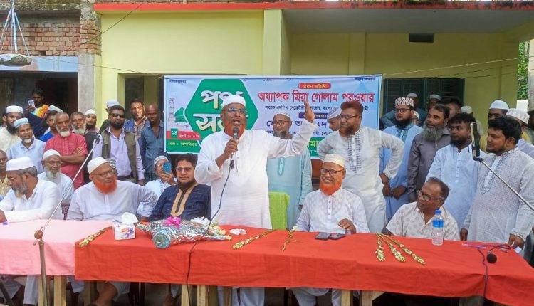 সন্ধ্যায় টোলনা স্কুল মাঠে ধামালিয়া ইউনিয়ন আমীর মোস্তাক আহমেদ চৌধুরীর সভাপতিত্বে ও শ্রমিক কল্যাণ ফেডারেশনের ডুমুরিয়া উপজেলা সাধারণ সম্পাদক মাওলানা মাহমুদ আলমের পরিচালনায় এক পথ সভা অনুষ্ঠিত হয়। সভায় অধ্যাপক মিয়া গোলাম পরওয়ার প্রধান অতিথির বক্তৃতা করেন। এ সময় তিনি বলেন, দ্বীন কায়েমের প্রচেষ্টা চালানো ঐচ্ছিক কোন বিষয়টি নয়; বরং প্রত্যেক মোমিনের ওপরই অত্যাবশ্যকীয় বা ফরয করে দেওয়া হয়েছে। মূলত, আমাদের জন্য ইসলামকেই জীবনবিধান হিসাবে মনোনীত করা হয়েছে। আর কালামে হাকীমকে আমাদের জীবন চলার পাথেয় হিসাবে প্রেরণ করা হয়েছে। বস্তুত, মোত্তাকীদের পথ পদর্শনের জন্যই পবিত্র কুরআন জীবন বিধান হিসাবে প্রেরণ করা হয়েছে। আর যারা প্রকৃতপক্ষে মুত্তাকী তারাই শুধু কুরআন থেকে লাভবান বা উপকৃত হতে পারে। তাই দুনিয়ায় শান্তি ও আখেরাতে মুক্তির জন্য আমাদের সকলকে আল্লাহর বিধান ও রাসূল (সা.) এর আদর্শের ছায়াতলে ঐক্যবদ্ধ হতে হবে। তিনি দ্বীন প্রতিষ্ঠার প্রত্যয়ে সকলকে ময়দানে ইস্পাত কঠিন ঐক্য গড়ে তোলার আহবান জানান।