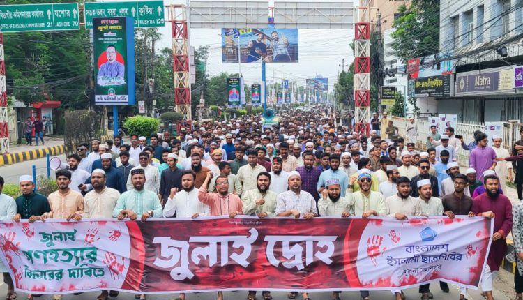 বাংলাদেশ ইসলামী ছাত্রশিবিরের কেন্দ্র ঘোষিত কর্মসূচির আলোকে “জুলাই দ্রোহ” শিরোনামে বিক্ষোভ মিছিলের আয়োজন করে বাংলাদেশ ইসলামী ছাত্রশিবির খুলনা মহানগর শাখা।