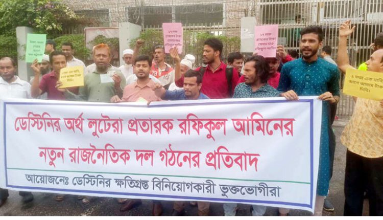 ডেসটিনি গ্রুপের ব্যবস্থাপনা পরিচালক মোহাম্মদ রফিকুল আমীনকে নতুন দলের নিবন্ধন না দিতে নির্বাচন কমিশনের সামনে বিক্ষোভ ও মানববন্ধন করেছেন ডেসটিনির ক্ষতিগ্রস্ত বিনিয়োগকারীরা। বিনিয়োগকারীদের পাওনা দ্রুত পরিশোধের পাশাপাশি রফিকুল আমীনের বিরুদ্ধে বিভিন্ন স্লোগান দেন তারা।