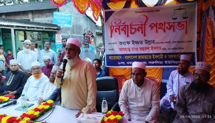 সরুলিয়া ইউনিয়ন জামায়াতের আমীর মাওলানা জহুরুল ইসলামের সভাপতিত্বে অনুষ্ঠিত পথসভায় আরো বক্তব্য রাখেন— তালা উপজেলা জামায়াতের সেক্রেটারি অধ্যাপক ইদ্রিস আলী, সুরা সদস্য মাওলানা রেজাউল করিম, অ্যাডভোকেট বাশারাতুল্লাহ আওরঙ্গী বাবলা, মেম্বার আব্দুল হামিদ, মাওলানা আব্দুর রাজ্জাক ও কবিরুল ইসলাম প্রমুখ।