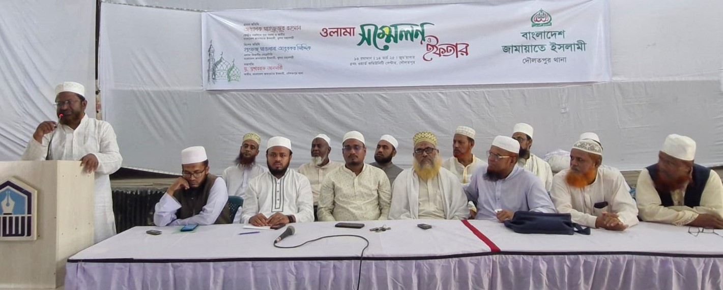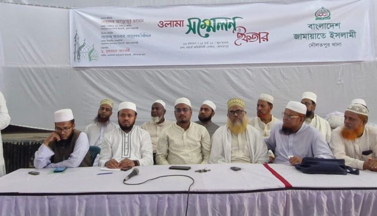 বাংলাদেশ জামায়াতে ইসলামীর কেন্দ্রীয় মজলিসে শূরার সদস্য ও খুলনা মহানগরী আমীর অধ্যাপক মাহফুজুর রহমান বলেছেন, দ্বীন বিজয়ের জন্য ওলামায়ে কেরামদের ঐক্যবদ্ধ হওয়া ছাড়া বিকল্প পথ নেই। তাদেরকে জাতির মিনার হিসেবে দাঁড়াতে হবে। আল্লাহর দ্বীন কায়েমের জন্য আল্লাহর নবী ও সাহাবায়ে কেরামদের পাগলপারা হয়ে কাজ করতে হবে। রাসুলের সাহাবীরা দ্বীন কায়েমের জন্য জান ও মালের ত্যাগ কুরবানিতে কোনো পরোয়া করেননি। তিনি বলেন, দীর্ঘ ১৫ বছর এদেশে আলেম ওলামাদের উপর চরম জুলুম নির্যাতন চালানো হয়েছে। দ্বীনের দাওয়াত দেওয়ার কারণে অতীতে অনেক নবীদের বিনা অপরাধে হত্যা করা হয়েছে। বাংলাদেশেও জামায়াতে ইসলামীর নেতাকর্মীসহ অসংখ্য আলেম ওলামাদের দ্বীন প্রতিষ্ঠার আন্দোলন করার অপরাধে বিনা বিচারে হত্যা করা হয়েছে। দেশের শতকরা ৯০ শতাংশ মুসলমানের দেশে আল্লাহর দ্বীন কায়েম হবেই হবে, ইনশাআল্লাহ। সোমবার (১৭ মার্চ) খুলনা মহানগরীর দৌলতপুর থানা জামায়াতে ইসলামীর উদ্যোগে স্থানীয় কমিউনিটি সেন্টারে ওলামা সম্মেলন ও ইফতার মাহফিলে প্রধান অতিথির বক্তৃতায় তিনি এ সব কথা বলেন।