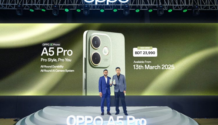 বাংলাদেশের বাজারে আনুষ্ঠানিকভাবে দীর্ঘস্থায়ী ‘অলরাউন্ড’ পারফরম্যান্সের স্মার্টফোন ‘অপো এ৫ প্রো’ উন্মোচন করা হয়েছে।নতুন এই স্মার্টফোনের ‘প্রোডাক্ট অ্যাম্বাসেডর’ হিসেবে এই ডিভাইসের সঙ্গে রয়েছেন- ‘অলরাউন্ডার’ মেহেদী হাসান মিরাজ। ‘অপো এ৫ প্রো’ বাংলাদেশের প্রথম স্মার্টফোন যেটি আন্তর্জাতিকভাবে সার্টিফিকেশনের পাশাপাশি বুয়েট এর ‘টপ-রেটেড ওয়াটার রেজিস্ট্যান্স এবং ড্রপ টেস্ট’-এ সফলতা দেখিয়েছে।