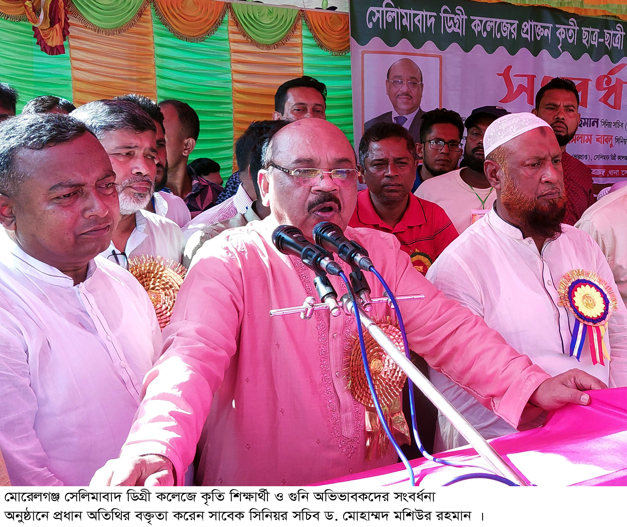 মোরেলগঞ্জ প্রতিনিধি: ‘দেশের শান্তি-শৃংখলা আশানুরূপ ভালো নেই। অনাকাঙ্খিত ঘটনাই বেশি ঘটছে। সর্বত্রই শৃংখলার অভাব মনে হচ্ছে। রানৈতিক অঙ্গন অস্থির। এ অবস্থা থেকে পরিত্রান ও দেশে শান্তি ফেরাতে দ্রুতই নির্বাচিত সরকার প্রয়োজন’। কথাগুলো বলেছেন বাংলাদেশ সরকারের সাবেক সিনিয়র সচিব ড. মোহাম্মদ মশিউর রহমান। শনিবার(৮ নভেম্বর) দুপুরে তিনি বাগেরহাটের মোরেলগঞ্জ সেলিমাবাদ ডিগ্রী কলেজে কৃতি শিক্ষার্থী ও গুনি অভিভাবকদের সংবর্ধনা অনুষ্ঠানে প্রধান অতিথির বক্তৃতা করেন।