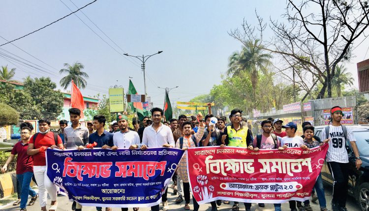 ধর্ষণ ও নারী নির্যাতনের প্রতিবাদে বিক্ষোভ করেছে খুলনা পাবলিক কলেজ ও সরকারি মডেল কলেজের শিক্ষার্থীরা