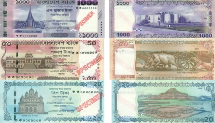 বৃহস্পতিবার বাংলাদেশ ব্যাংক এক বিজ্ঞপ্ততিতে এসব তথ্যা জানিয়েছে। ১০০ টাকার নোটে জলছাপ হিসেবে একপাশে বামপাশে জাতীয় স্মৃতিসৌধ ও পেছনভাগের ডিজাইন হিসেবে জাতীয় সংসদ ভবনের মুদ্রিত ছবি রয়েছে। এ ছাড়া ৫০ টাকার নোটে আহসান মঞ্জিল ও শিল্পাচার্য জয়নুল আবেদিন এর বিখ্যাত চিত্রকর্ম ‘সংগ্রাম’ মুদ্রিত রয়েছে। এ দিকে ২০ টাকার নোটে রয়েছে দিনাজপুরের কান্তজিউ মন্দির এবং নওগাঁর পাহাড়পুর বৌদ্ধবিহারের মুদ্রিত ছবি রয়েছে।