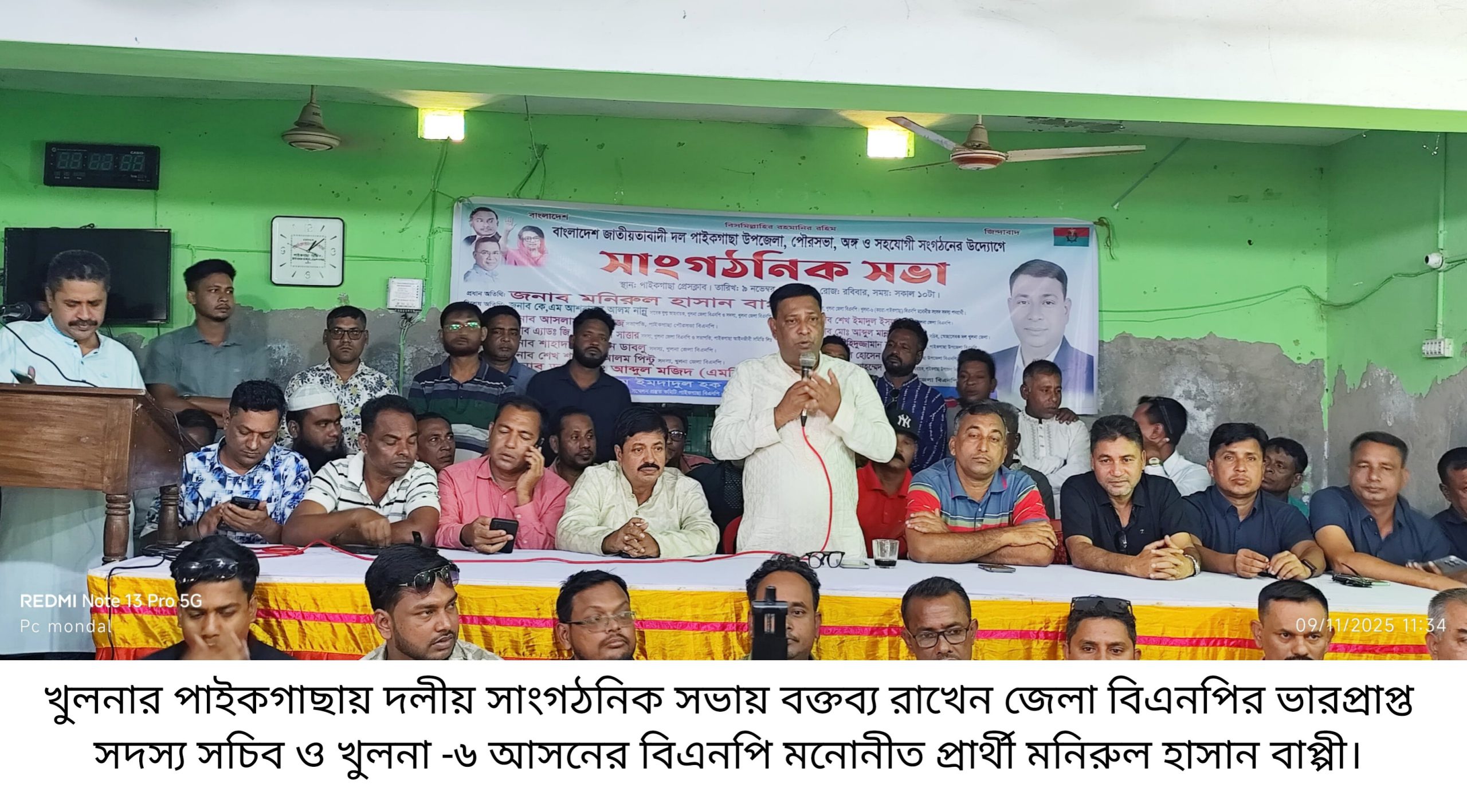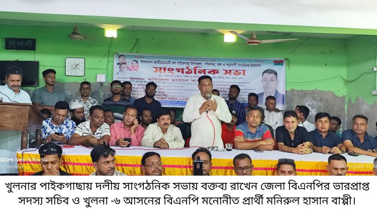 পাইকগাছা ( খুলনা) প্রতিনিধি:খুলনা জেলা বিএনপির ভারপ্রাপ্ত সদস্য সচিব ও খুলনা – ৬ আসনের বিএনপি মনোনীত প্রার্থী মনিরুল হাসান বাপ্পীর ধানের শীষ প্রতীক এবং ত্রয়োদশ জাতীয় সংসদ নির্বাচন উপলক্ষে উপজেলা ও পৌরসভা বিএনপি এবং সকল অঙ্গ সহযোগী সংগঠন রোববার সকালে পাইকগাছা প্রেসক্লাব মিলনায়তনে গুরুত্বপূর্ণ এ সাংগঠনিক সভার আয়োজন করে।