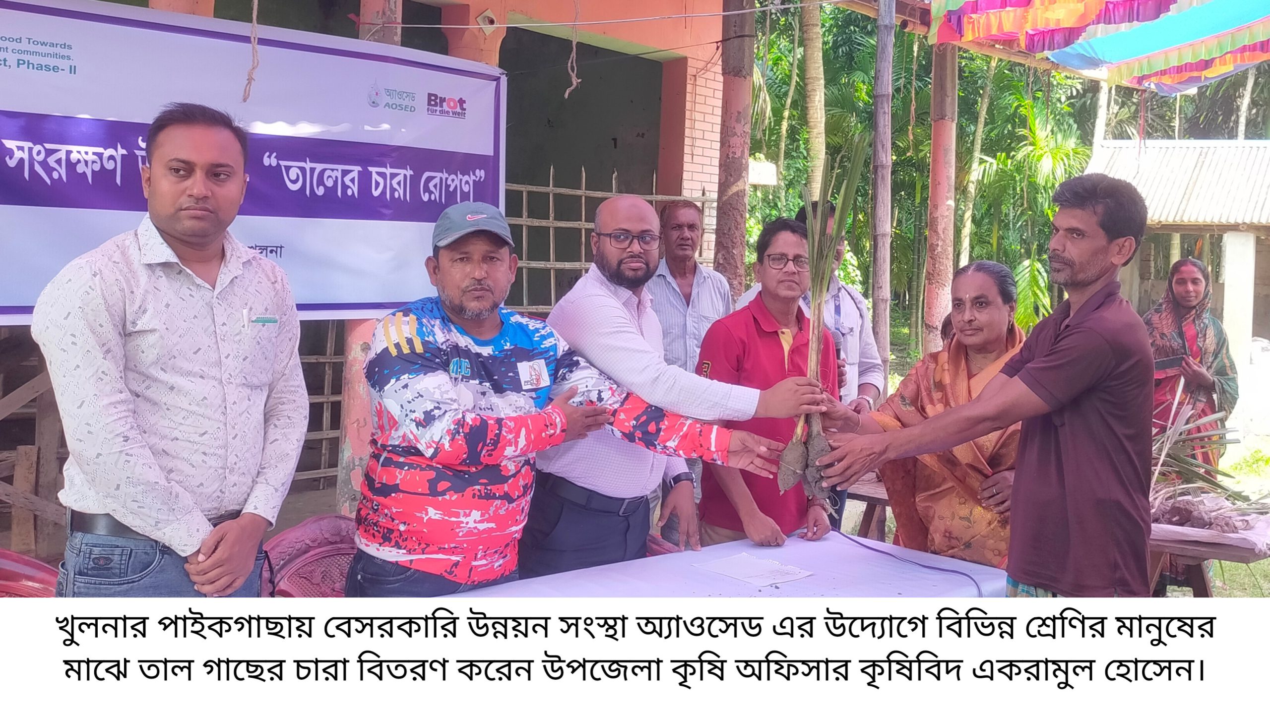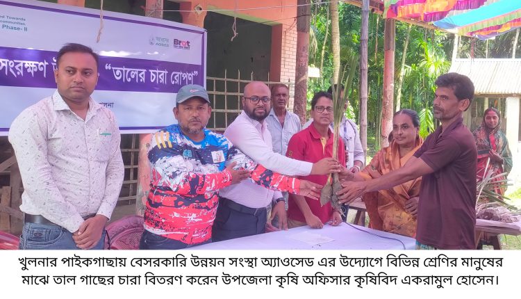পাইকগাছা (খুলনা) প্রতিনিধি:পাইকগাছায় বিভিন্ন শ্রেণির মানুষের মাঝে তাল গাছের চারা বিতরণ করা হয়েছে। ৩ নভেম্বর সোমবার দুপুরে পরিবেশ সংরক্ষণের উদ্যোগ এর অংশ হিসেবে উপজেলার হরিঢালী ইউনিয়নের রামনাথপুর পূজা মন্দির চত্বরে তাল গাছের চারা বিতরণের আয়োজন করে বেসরকারি উন্নয়ন সংস্থা অ্যাওসেড। স্থানীয় কৃষক সুভাষ মন্ডলের সভাপতিত্বে অনুষ্ঠানে প্রধান অতিথি ছিলেন উপজেলা কৃষি অফিসার কৃষিবিদ মোঃ একরামুল হোসেন।
