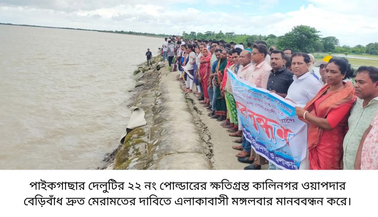 মেরামত সহ ভাঙ্গন রোধে জিও ব্যাগ স্থাপন জরুরি মনে করছে ঝুঁকিপূর্ন এলাকার মানুষ। এলাকার শত শত মানুষ মঙ্গলবার দুপুরে বাঁধের উপর দাঁড়িয়ে মানববন্ধন করে ক্ষতিগ্রস্ত বাঁধ দ্রুত মেরামতের দাবি জানিয়েছে পানি উন্নয়ন বোর্ড সহ সংশ্লিষ্ট কতৃপক্ষের আশু হস্তক্ষেপ কামনা করেন। দেলুটি ইউনিয়ন পরিষদের ভারপ্রাপ্ত চেয়ারম্যান সুকুমার কবিরাজের সভাপতিত্বে ও ইউপি সদস্য পলাশ কান্তি রায়ের সঞ্চালনায় মানববন্ধন কর্মসূচিতে বক্তব্য রাখেন সাবেক ইউপি চেয়ারম্যান সমরেশ হালদার, ইউপি সদস্য রামচন্দ্র টিকাদার, রিংকু রায়, বদিউজ্জামান, মেরি রাণী, দেলুটি ইউনিয়ন জামায়াতের আমীর মোস্তফা সরদার, প্রভাষক কল্যাণ মন্ডল, ধীমান মন্ডল, দ্বিজেন্দ্র নাথ মন্ডল, সন্তোষ গাইন, উৎপল রায়, শিশির মন্ডল, শিমুল মন্ডল, মিহির সরকার, শ্যামল কান্তি রায়, মালতী মন্ডল, শিক্ষার্থী পিয়া মন্ডল ও তৃপা সরকার। মানববন্ধনে বক্তারা ত্রাণ নয়, টেকসই বেড়িবাঁধের দাবি জানান।
