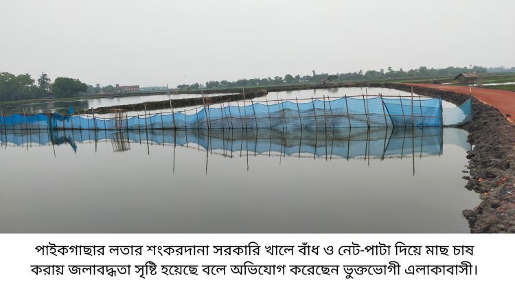 পাইকগাছার লতার শংকরদানা সরকারি খালে অবৈধভাবে বাঁধ এবং নেট-পাটা দিয়ে মাছ চাষ করায় মৌসুমের প্রথম বর্ষায় জলাবদ্ধতা সৃষ্টি হয়েছে।