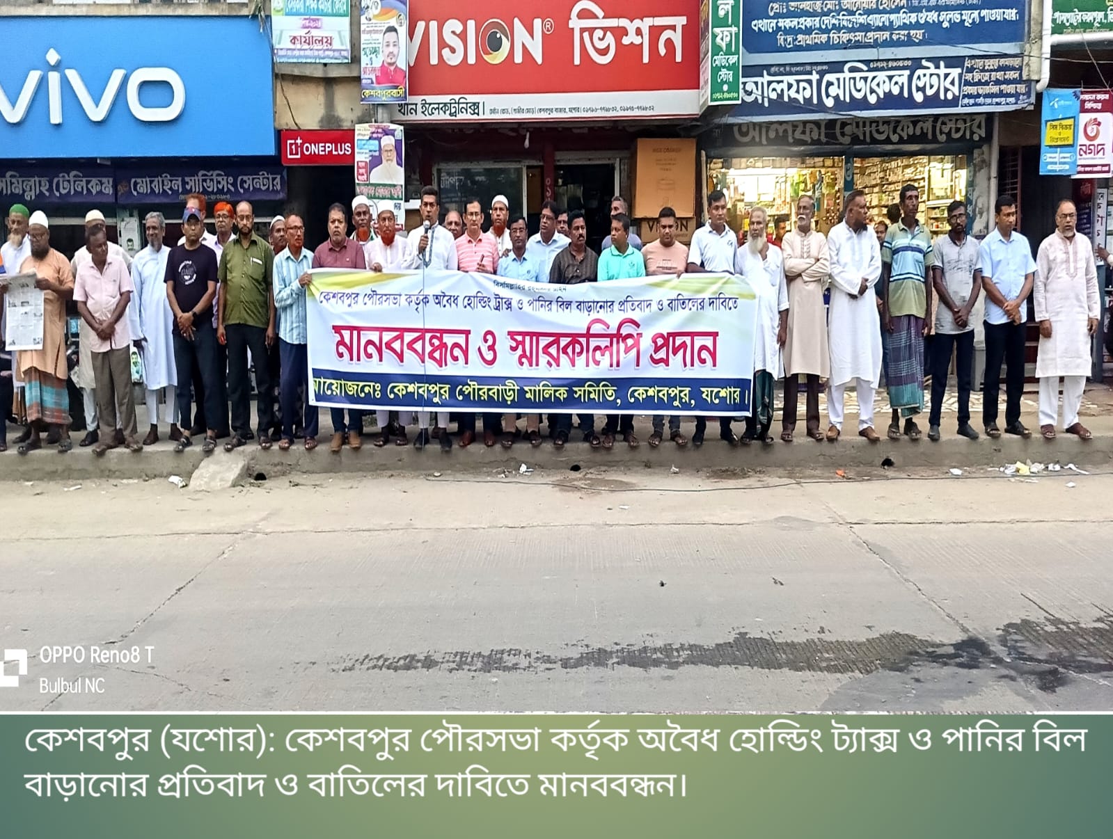 কেশবপুর ( যশোর) প্রতিনিধি :যশোরের কেশবপুর পৌরসভা কর্তৃক অবৈধ হোল্ডিং ট্যাক্স ও পানির বিল বাড়ানোর প্রতিবাদ ও বাতিলের দাবিতে সোমবার( ২৭ অক্টোবর) বিকালে ত্রিমোহিনি চত্বরে কেশবপুর পৌর বাড়ি মালিক সমিতির আয়োজনে মানববন্ধন অনুষ্ঠিত হয়েছে। কেশবপুর পৌর বাড়ি মালিক সমিতির সভাপতি মোঃ আশরাফুজ্জামান এর উদ্যোগে এবং পৌর বাড়ি মালিক সমিতির সকলের সহযোগিতায় কেশবপুর পৌরসভা কর্তৃক অবৈধ হোল্ডিং ট্যাক্স ও পানির বিল বাড়ানোর প্রতিবাদ ও বাতিলের দাবিতে এই মানববন্ধনের আয়োজন করা হয়।
