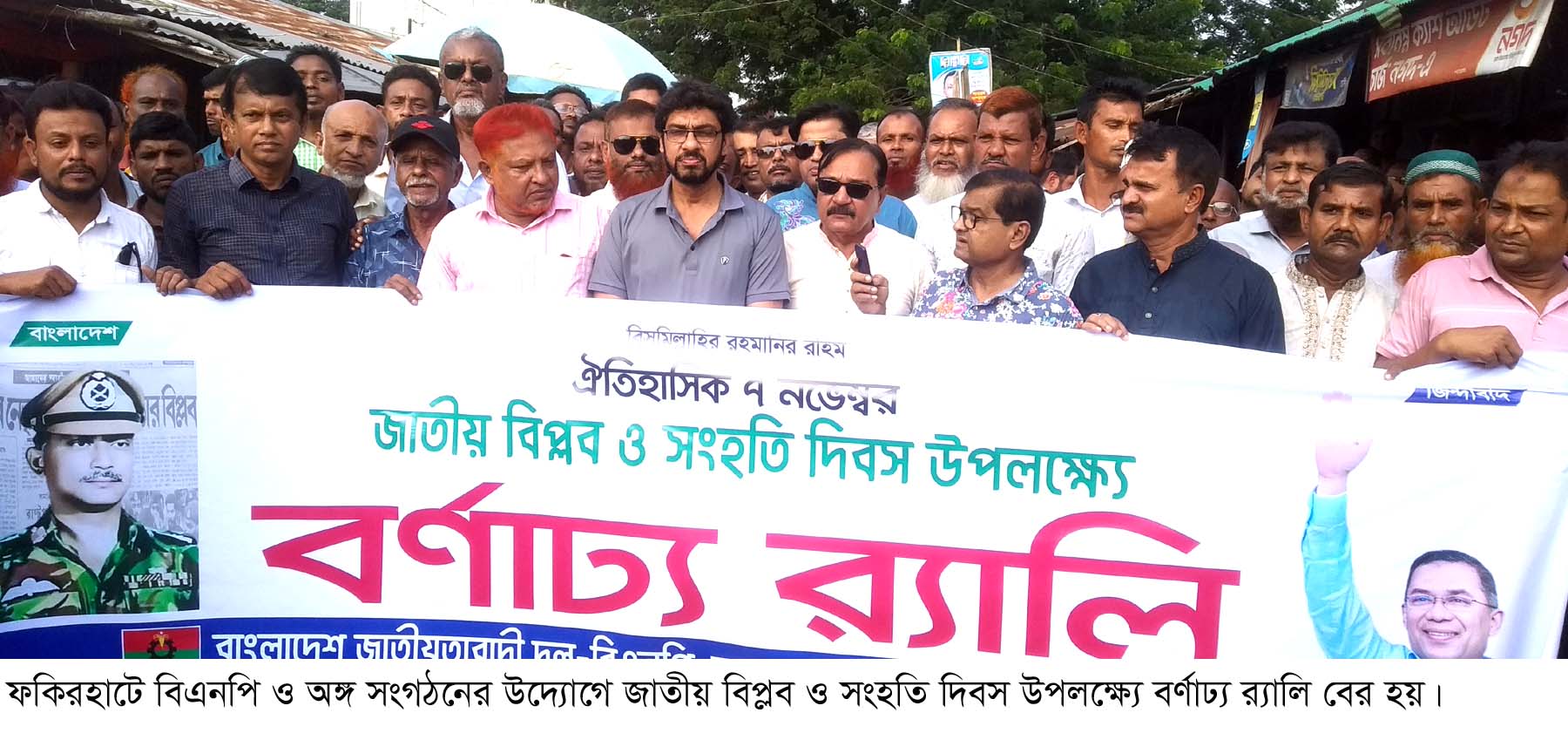ফকিরহাট (বাগেরহাট) প্রতিনিধি :বাগেরহাটের ফকিরহাটে জাতীয় বিপ্লব ও সংহতি দিবস পালিত হয়েছে। এ উপলক্ষ্যে বর্ণাঢ্য র‌্যালি ও আলোচনা সভা অনুষ্ঠিত হয়েছে।