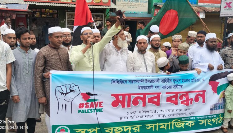 ফিলিস্তিনে ইসরাইলী হামলার প্রতিবাদে খুলনায় সামাজিক সংগঠনের মানব বন্ধন