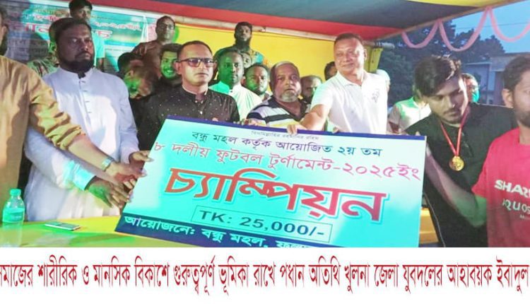 ফুলতলা রি ইউনিয়ন মডেল স্কুল এন্ড কলেজ মাঠে বন্ধু মহলের আয়োজনে ৮ দলীয় ফুটবল টুর্নামেন্টের ফাইনাল ম্যাচ বুধবার দুপুর ৩ টায় অনুষ্ঠিত হয়। সংকট পাশা ফুটবল একাদশ নোয়াপাড়া ও বন্ধু মহল ফুলতলা এ দুই দলের মধ্যে ফাইনাল ম্যাচ অনুষ্ঠিত হয়। ফুলতলা ইউনিয়নের বারবার নির্বাচিত চেয়ারম্যান ও ফুলতলা উপজেলা বিএনপি আহবায়ক মোঃ শেখ আবুল বাশারের সভাপতিত্বে প্রধান অতিথি হিসেবে উপস্থিত ছিলেন খুলনা জেলা যুবদলের আহবায়ক ও খুলনা ৫ ফুলতলা- ডুমুরিয়া সংসদ সদস্য হিসেবে বিএনপির মনোনয়ন প্রত্যাশী ইবাদুল হক রুবায়েত, উদ্বোধন করেন সাবেক ইউপি সদস্য মোল্লা আলমগীর হোসেন, বিশেষ অতিথি হিসেবে উপস্থিত ছিলেন ফুলতলা উপজেলা বিএনপি’র সদস্য সচিব মনির হাসান টিটো, ফুলতলা ইউনিয়ন বিএনপি’র সিনিয়র যুগ্ন আহবায়ক মোঃ মহসিন মোল্লা, ইউনিয়ন বিএনপি সদস্য সচিব মোঃ আনিচুর রহমান পলাশ, ফুলতলা রিইউনিয়ন স্কুল এন্ড কলেজে অধ্যক্ষ অজয় কুমার চক্রবর্তী,মোঃ হুমায়ুন আহমেদ ভূঁইয়া, মোঃ সেলিম সরদার, আনোয়ার হোসেন বাবু, ওয়াহিদুজ্জামান মোল্লা নান্না, মোল্লা মনিরুল ইসলাম, এনামুল হক পারভেজ, নাসির উদ্দিন মোল্লা, রবিউল ইসলাম রবি, খান জিয়াউর রহমান, আল মামুন মোল্লা, মিজানুর রহমান টিটু, রাজিব মোল্লা, রেজওয়ান মোল্লা, আতিক নেওয়াজ চঞ্চল, আব্দুল্লাহ হেল কাফি সখা, ইঞ্জিনিয়ার জাহিদ হাসান শোভন, জিহাদুল হক জিহাদ, এ্যাড ইমরুল বারীপ্রমুখ। প্রধান অতিথির বক্তব্য ইবাদুল হক রুবায়েত বলেন বিগত ফ্যাসিস্ট সরকার ক্রীড়াঙ্গনের ভিতরে রাজনীতি ঢুকিয়ে দেশের ক্রীড়াঙ্গনের ধ্বংস করে দিয়েছে, মাশরাফি বিন মর্তুজা শাকিব আল হাসানের মত বিশিষ্ট ক্রীড়া ব্যক্তিত্ব রাজনৈতিক রোষানলে পড়ে এখন জনগণের ঘৃণার পাত্রে পরিণত হয়েছে। তিনি আরও বলেন দেশ নায়ক তারেক রহমানের নেতৃত্বে বিএনপি ক্ষমতায় এলে বাংলাদেশকে রাজনীতিমুক্ত ক্রীড়াঙ্গন উপহার দেওয়া হবে।