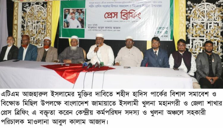 বাংলাদেশ জামায়াতে ইসলামীর কেন্দ্রীয় কর্মপরিষদ সদস্য খুলনা অঞ্চলের সহকারী পরিচালক মাওলানা আবুল কালাম আজাদ বলেছেন, ফ্যাসিস্ট শেখ হাসিনার শাসনামলে বিচারিক কার্যক্রমগুলো সারা বিশ্বে বিতর্কিত, প্রশ্নবিদ্ধ ও প্রত্যাখ্যাত। স্বৈরাচারের আমলে গ্রেফতার এটিএম আজহারুল ইসলামকে কারাগারে আটক রাখা তার প্রতি চরম জুলুম ও অন্যায় ছাড়া আর কিছুই নয়। ফ্যাসিবাদমুক্ত বাংলাদেশে তাকে এখনো আটক রাখায় জাতি বিস্মিত ও হতবাক। দেশবাসী স্বৈরাচারের কবল থেকে পরিপূর্ণভাবে মুক্তি চায়। এই পরিস্থিতিতে জামায়াতে ইসলামীর সহকারী সেক্রেটারি জেনারেল এটিএম আজহারুল ইসলামকে অবিলম্বে মুক্তি দেওয়ার জন্য অন্তবর্তীকালীন সরকারের প্রতি জোর দাবি জানাচ্ছি। তিনি বলেন, ইতোমধ্যে মৃত্যুদন্ডপ্রাপ্ত, যাবজ্জীবন সাজাপ্রাপ্ত আসামীদের খালাস দেয়া হয়েছে। সরকার ইচ্ছা করলে মজলুম জননেতা এটিএম আজহারুল ইসলামকে খালাস দিতে পারেন। তাই সরকারের প্রতি আহ্বান দ্রুত তাকে মুক্তি দেয়া হোক। সোমবার (১৭) সকালে খুলনা প্রেসক্লাবের লিয়াকত আলী মিলনায়তনে অনুষ্ঠিত প্রেসব্রিফিংয়ে তিনি এসব কথা বলেন। জামায়াত নেতা এটিএম আজহারুল ইসলামের মুক্তির দাবিতে মঙ্গলবার (১৮ ফেব্রুয়ারি) শহীদ হাদিস পার্কের বিশাল সমাবেশ ও বিক্ষোভ মিছিল উপলক্ষ্যে খুলনা মহানগরী ও জেলা জামায়াতে ইসলামী এই ব্রিফিংয়ের আয়োজন করে।