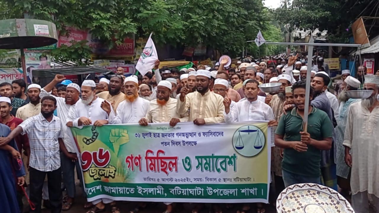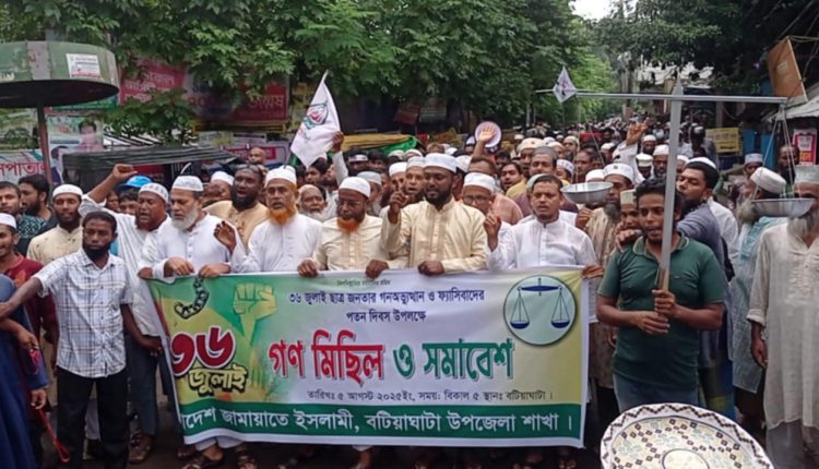 বটিয়াঘাটা প্রতিনিধিঃ-৩৬ জুলাই ছাত্র জনতার গনঅভ্যুত্থান ও ফ্যাসিবাদের পতন দিবস উপলক্ষে গত মঙ্গলবার বিকাল ৩টায় বটিয়াঘাটা জামায়াতে ইসলামীর আয়োজনে গণ মিছিল ও সমাবেশ অনুষ্ঠিত হয়।