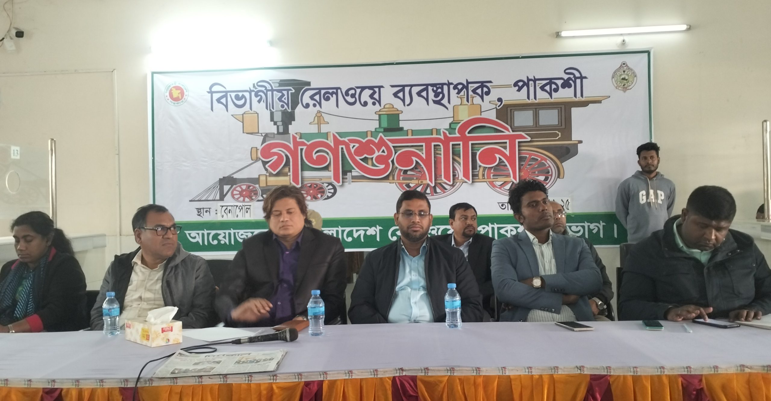 মঙ্গলবার (২৩ ডিসেম্বর) বেনাপোল রেলওয়ে স্টেশনের ইমিগ্রেশন ভবনে এ গণশুনানি অনুষ্ঠিত হয়। গণশুনানিতে প্রধান অতিথি হিসেবে উপস্থিত ছিলেন বিভাগীয় রেলওয়ে ব্যবস্থাপক লিয়াকত শরীফ। এ সময় আরো উপস্থিত ছিলেন ময়েন উদ্দীন সর্দার বিভাগীয় যান্ত্রিক প্রকৌশলী (লোকো),