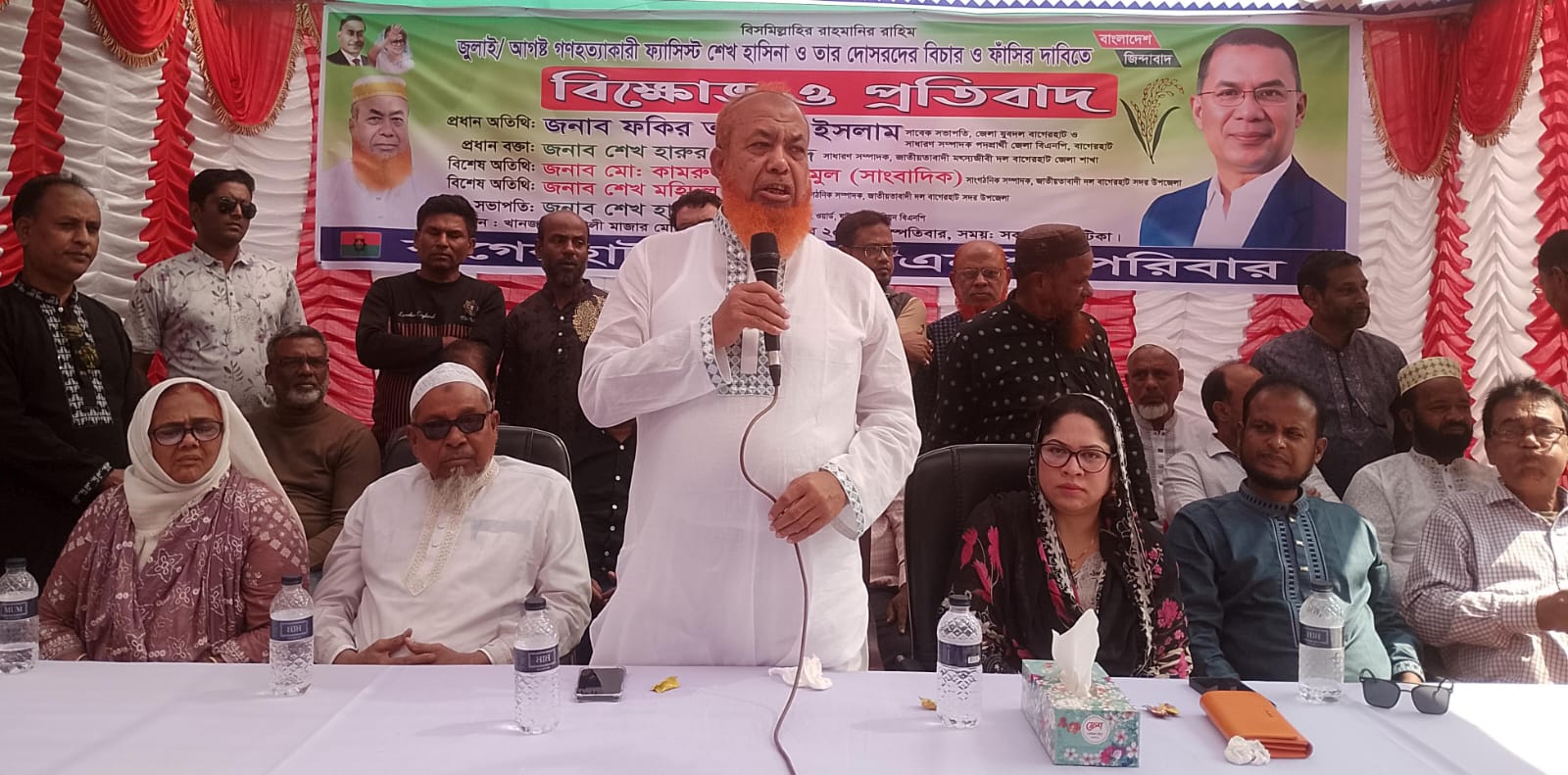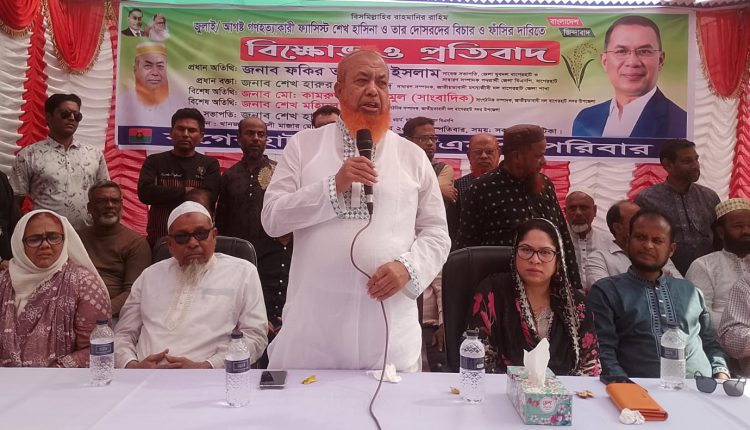 প্রধান অতিথির বক্তৃতায় ফকির তারিকুল ইসলাম বলেন, হাসিনা সরকার ক্ষমতায় থাকাকালে বিরোধী দলের নেতাকর্মীদের উপর ব্যাপক নির্যাতন নিপীড়ন চালিয়েছে। হত্যা গুম সহ জঘন্য কর্মকান্ড পরিচালনা করেছে। তার অত্যাচারে অতিষ্ঠ দেশবাসী পদত্যাগের দাবিতে আন্দোলন শুরু করলে সে গণহারে নির্যাতন চালায়। সর্বশেষ ছাত্র জনতার আন্দোলনে ভারতে পালিয়ে যায় শেখ হাসিনা। কিন্তু যাওয়ার আগে এ দেশের হাজার হাজার ছাত্র-জনতা হত্যা ও পঙ্গু করে গেছে। এই হত্যার দায় সে কোনোভাবেই এড়াতে পারে না। আজকের এই প্রতিবাদ সবার মাধ্যমে শেখ হাসিনা ও তার দোসরদের বিচার ও ফাঁসি দাবি করেন ফকির তারিকুল ইসলাম।