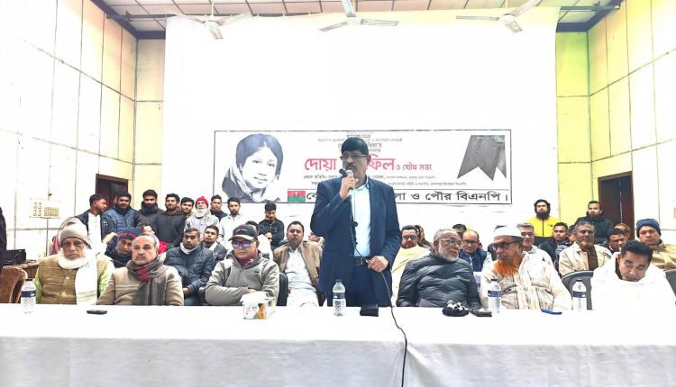 এ উপলক্ষে রবিবার (৪ জানুয়ারী) বিকালে স্থানীয় পাইলট স্কুল এন্ড কলেজ অডিটোরিয়ামে স্থানীয় বিএনপি আয়োজিদ, সাবেক প্রধানমন্ত্রী বেগম খালেদার জিয়া’র রুহের মাগফেরাত কামনা বিএনপির যৌথ সভায় সভাপতিত্ব করেন, উপজেলা বিএনপির সভাপতি ও কেন্দ্রীয় কার্যনির্বাহী কমিটির সদস্য এবং যশোর-৬ কেশবপুর আসনের বিএনপির মনোনীত প্রার্থী আবুল হোসেন আজাদ। যৌথ সভায় প্রধান অতিথি হিসেবে উপস্থিত ছিলেন যশোর জেলা বিএনপির সাধারন সম্পাদক দেলোয়ার হোসেন খোকন, বিশেষ অতিথি হিসেবে উপস্থিত ছিলেন জেলার সাংগঠনিক সম্পাদক ইঞ্জিনিয়ার রবিউল ইসলাম রবু।