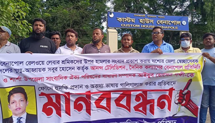 বেনাপোল রেলওয়ে লেবার শ্রমিকদের উপর হামলার সংবাদ প্রকাশ করায় আনন্দ টেলিভিশন ও দৈনিক কল্যাণের বেনাপোল প্রতিনিধি এবং শার্শা উপজেলা সাংবাদিক ঐক্য পরিষদের সাধারণ সম্পাদক আইয়ুব হোসেন পক্ষী-কে মোবাইল ফোনে হুমকি প্রদান ও অকথ্য ভাষায় গালিগালাজ করার প্রতিবাদে মানববন্ধন করেছে শার্শা উপজেলা সাংবাদিক ঐক্য পরিষদ সহ সর্বস্তরের সাংবাদিকবৃন্দ।