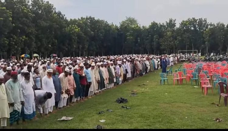 কেউ নির্দেশ না দিয়েই হাজারো মানুষ স্বতঃস্ফূর্তভাবে নামাজের প্রস্তুতি নেন। মাঠের এক পাশে অস্থায়ীভাবে নামাজের জামাতের আয়োজন করা হয়, যেখানে বক্তা থেকে শুরু করে সাধারণ অংশগ্রহণকারী—সবাই একসঙ্গে নামাজে অংশগ্রহণ করেন।