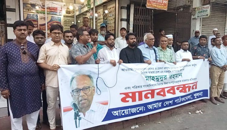 শনিবার বিকেলে নগরীর ব্যস্ততম অফিস পাড়াখ্যাত আহসান আহমেদ রোডে দৈনিক আমার খুলনার ব্যুরোর সামনের সড়কে অনুষ্ঠিত মানববন্ধন ও বিক্ষোভ সমাবেশে এ সব দাবি জানানো হয়। বক্তারা বলেন, মাহমুদুর রহমান কেবলমাত্র একজন সম্পাদক ও প্রকাশক নন। তিনি আজকের বাংলাদেশের সময়েরক ষ্টিপাথরে যাচাইকরাএকজনখাঁটি দেশপ্রেমিকমানুষ। যিনিঅতীতেও দেশবিরোধী সকল প্রতিক্রিয়াশীল গোষ্ঠীর বিরুদ্ধে ছিলেন সোচ্চার, আজকেও একই ভাবে তার লড়াই অব্যাহত রেখেছেন। যারা বাংলাদেশে পুনরায় হাসিনার ফ্যাসিবাদী শাসন ব্যবস্থা ফিরিয়ে আনতে চায়, যারা চায় ভারতের তাবেদারীব্যবস্থা পুনরায়কায়েমকরতে- মোস্তফাকামালতাদেরই অগ্রজ প্রতিনিধি। আমার দেশ পত্রিকায়প্রকাশিতসংবাদের প্রেক্ষিতেমামলা দায়ের এ কথারসত্যতাপ্রমাণ দেয়।