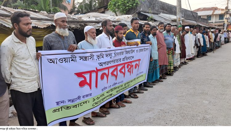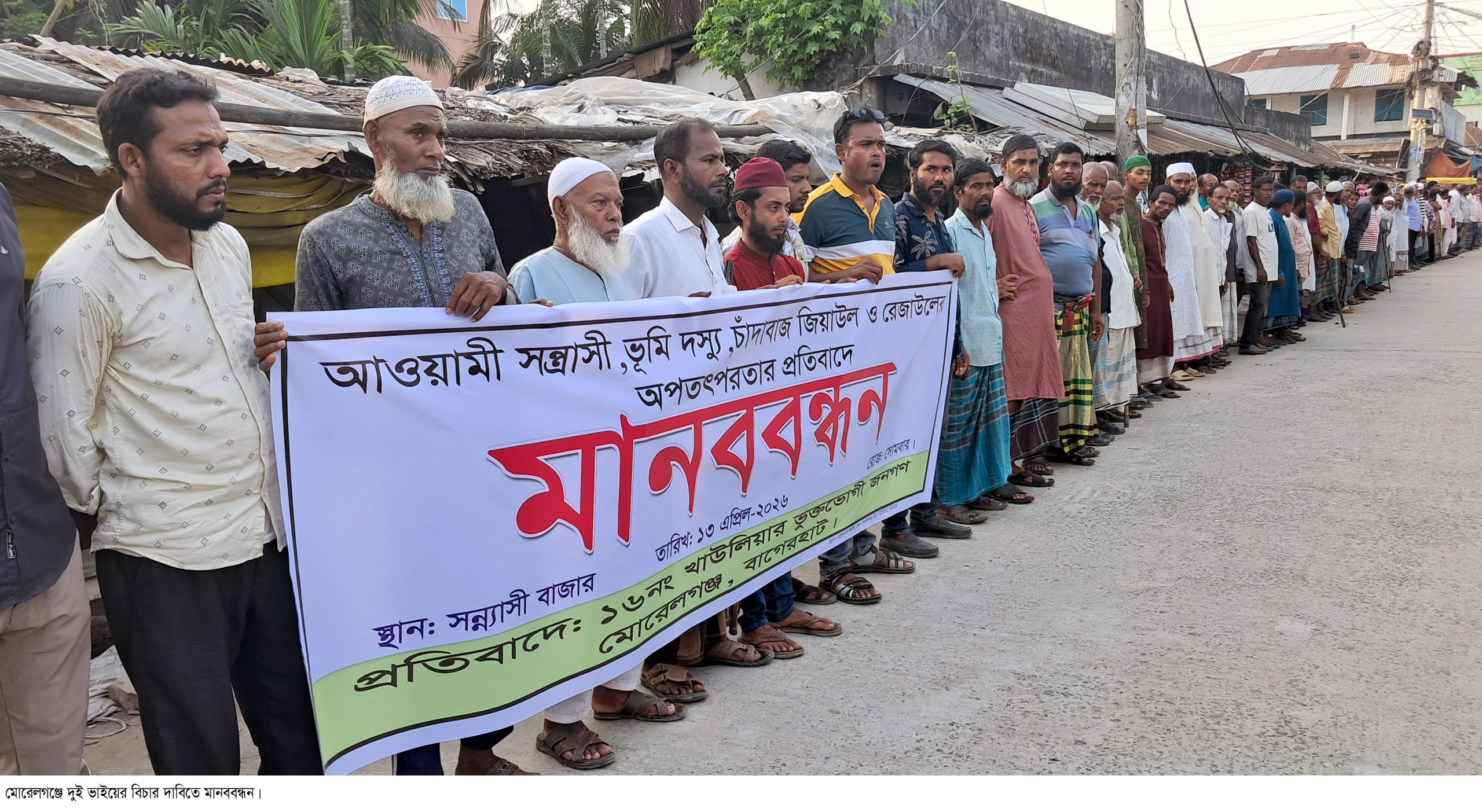 মোরেলগঞ্জ প্রতিনিধি:  বাগেরহাটের মোরেলগঞ্জে আপন দুই ভাইয়ের অপতৎপরতার প্রতিবাদে মানববন্ধন অনুষ্ঠিত হয়েছে। সোমবার(১৩ এপ্রিল) বিকেল ৫টার দিকে সন্ন্যাসী বাজার এলাকায় অনুষ্ঠিত মানববন্ধনে বিভিন্ন শ্রেণি-পেশার শতাধিক মানুষ অংশ গ্রহন করেন। মানববন্ধনে সন্ন্যাসী গ্রামের আপন দুই ভাই মো. জিয়াউল হাসান ও রেজাউল আহসানের বিরুদ্ধে ভূমিদস্যুতা, মারপিট, মিথ্যা মামলায় হয়রানী ও জালিয়াতির অভিযোগ তোলেন স্থানীয়রা।