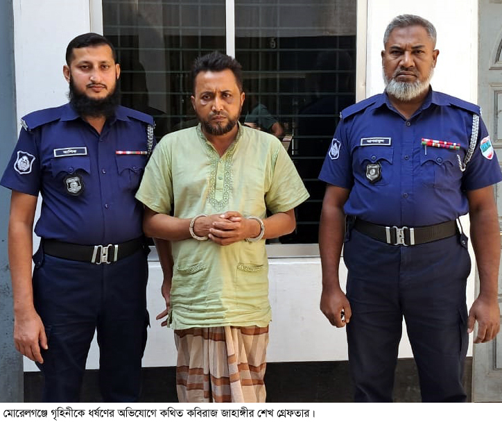 মোরেলগঞ্জ প্রতিনিধি:বাগেরহাটের মোরেলগঞ্জে এক গৃহিনীকে ধর্ষণ শেষে মাথার চুল কেটে নেওয়ার অভিযোগে জাহাঙ্গীর শেখ(৪৮) নামে এক কবিরাজকে গ্রেফতার করেছে পুলিশ। শুক্রবার রাতে পুলিশ তাকে গ্রেফতার করে শনিবার( ৮ নভেম্বর) বাগেরহাট আদালতে সোপর্দ করেছে। সে জোকা গ্রামের মুনসুর শেখের ছেলে। জাহাঙ্গীর শেখ কবিরাজ পরিচয়ে জোকা গ্রামে ‘খানকায়ে কাদরিয়া’ নামে একটি দরবার খুলে সেখানে দীর্ঘদিন ধরে ঝাঁড়ফুক দিয়ে নানা রোগের চিকিৎসা করে আসছেন।